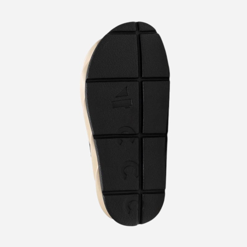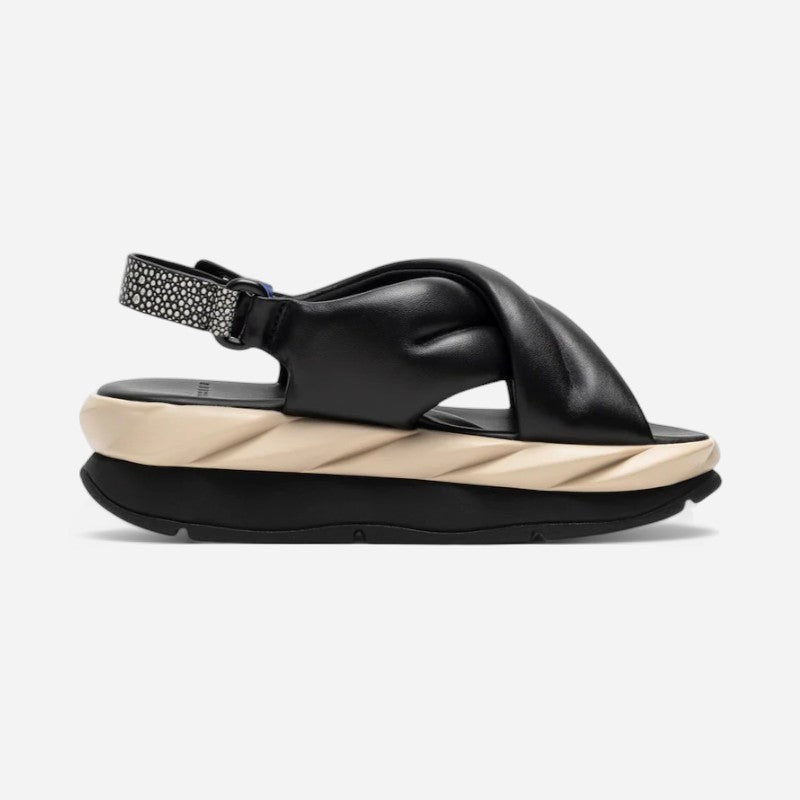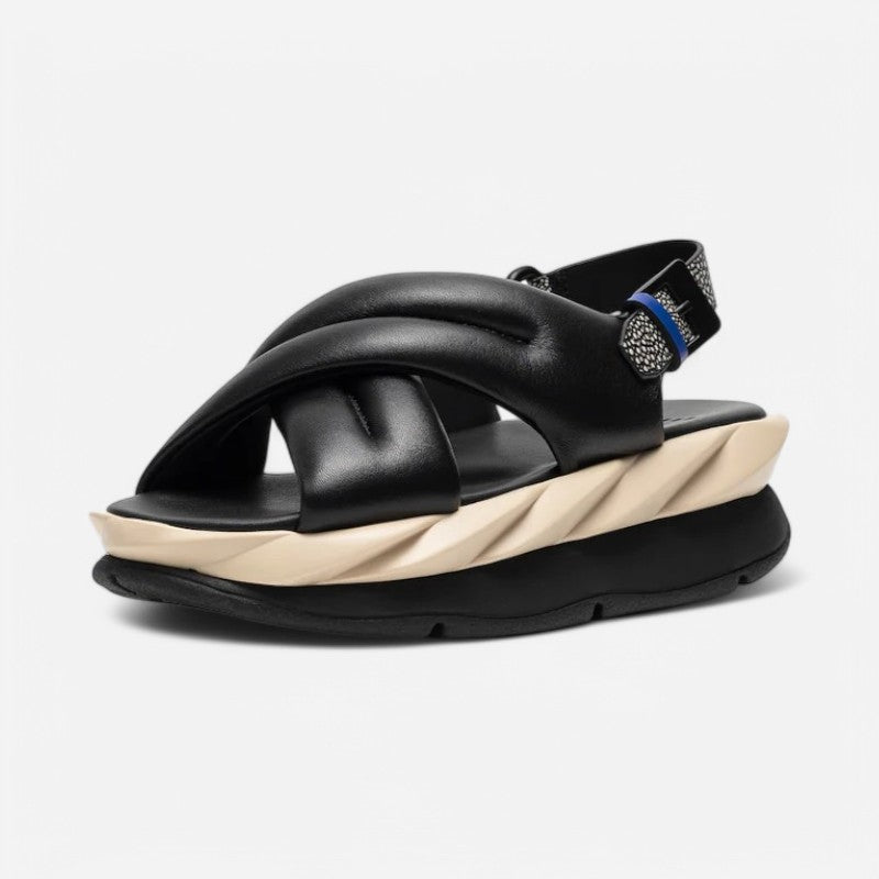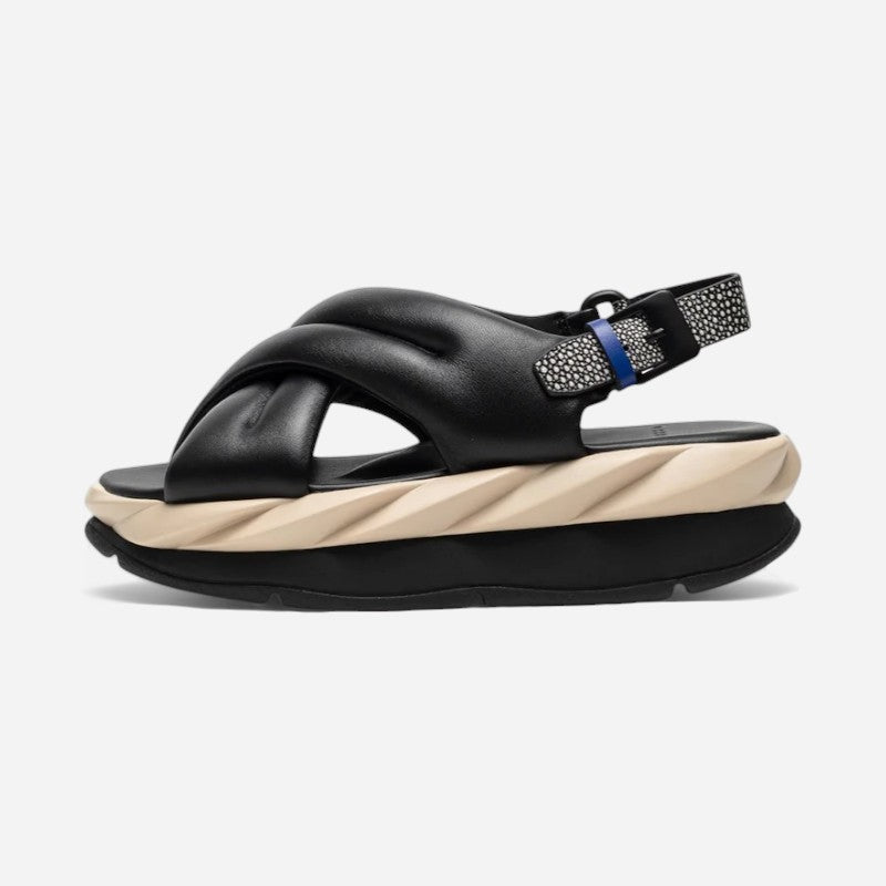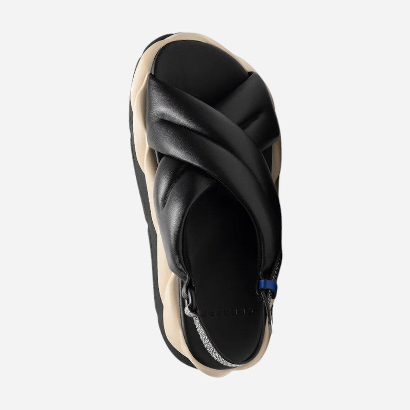 Inspired by the twisting motion of flower petals or whipped cream, MELLOW’s outsole is divided into a sturdy bottom and a softer, ripple-designed upper part for superior shock absorption and durability. The Mellow Moa is an iconic cross-strap sandal in smooth sheep leather, featuring an adjustable back strap and contrasting metal buckle for a standout summer look.