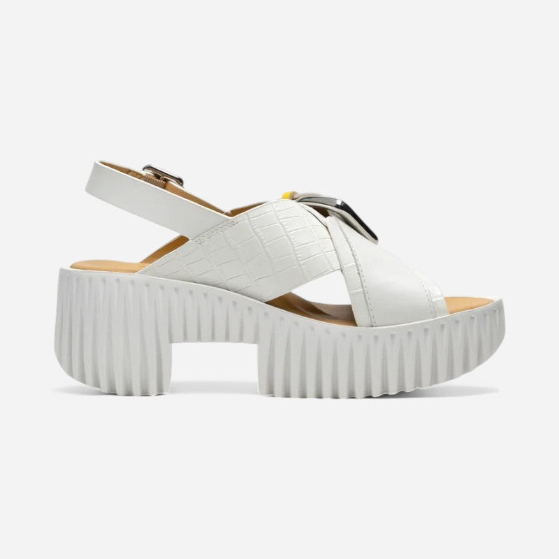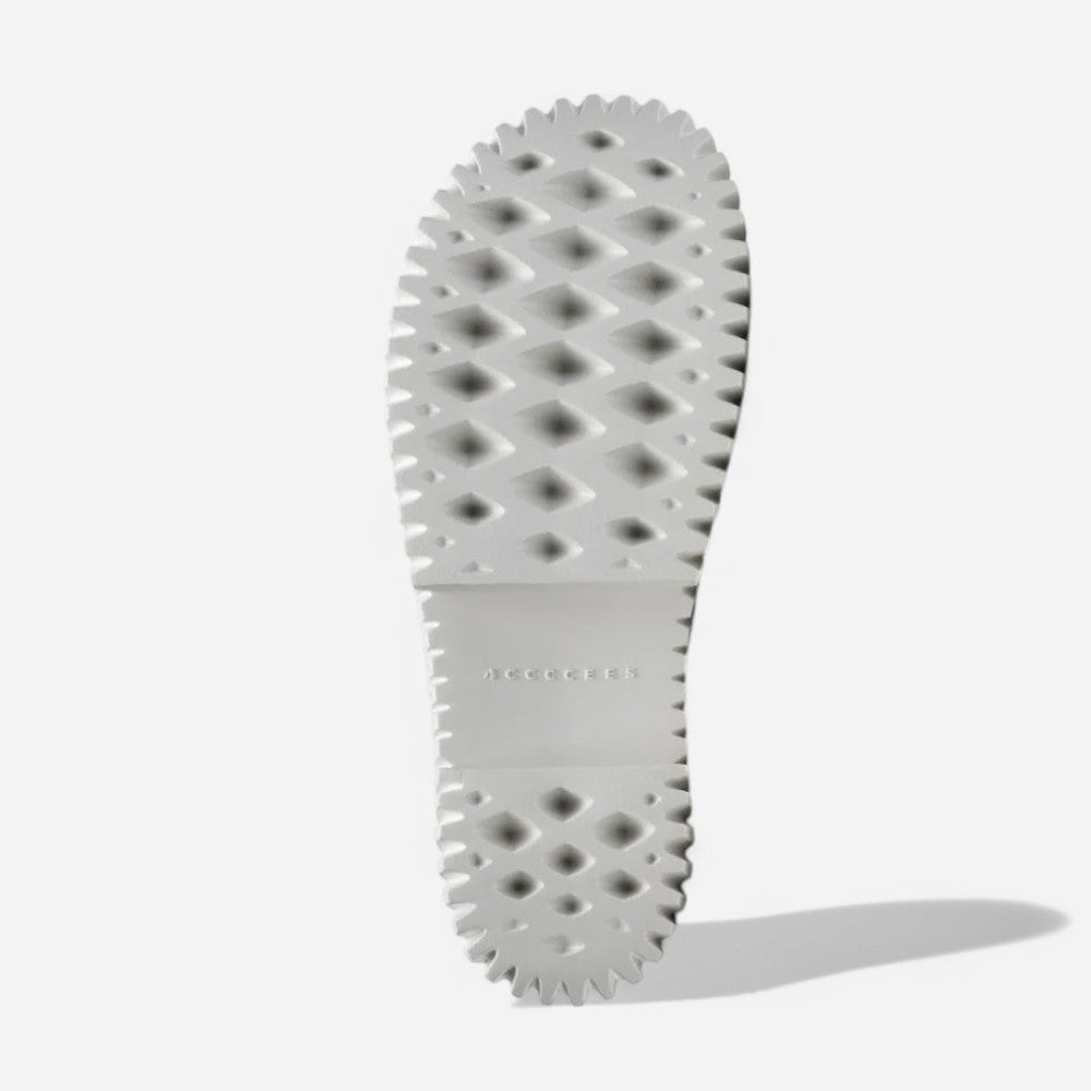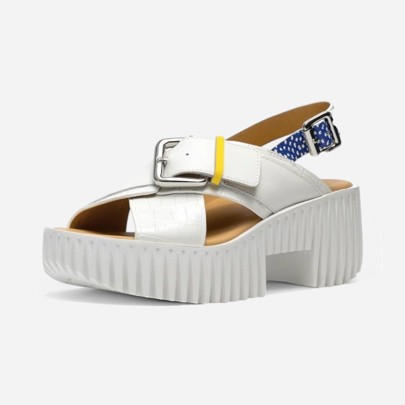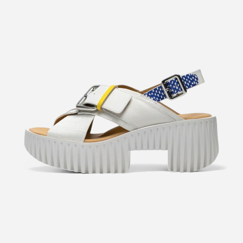 Carved from foam rubber to mimic natural textures like dandelion heads and mushroom gills, PLIA embodies buoyancy and lightness. Inspired by traditional chunky wooden clogs, the base of the shoe combines flexible, modern materials with a voluminous silhouette. The Plia Juno is a wide cross-strap sandal blending an understated silhouette with vivid colour touches accented with bold metallic buckles. This versatile style is suited for both dressy and casual occasions.