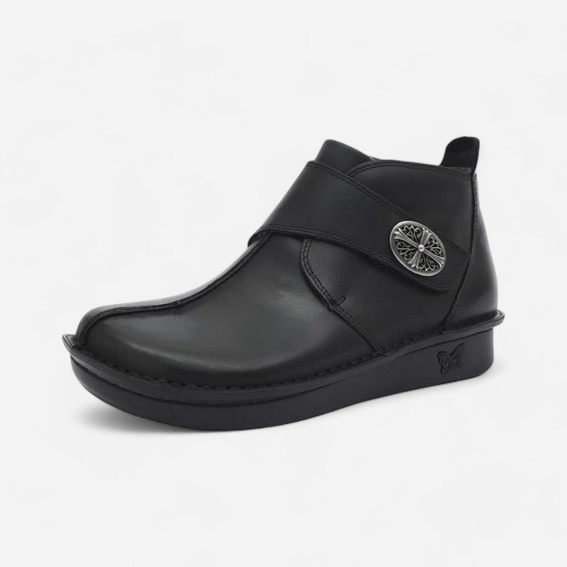 The Caiti is a casual ankle boot on the mini outsole, along with hand stitching and a detailed buckle. Complete with warm lining and adjustable strap across the vamp for easy slip-on and off. Perfect for transitioning seasons, the Caiti is a casual flat ankle bootie in a beautiful laser etched Ink Impressions print on genuine leather upper.