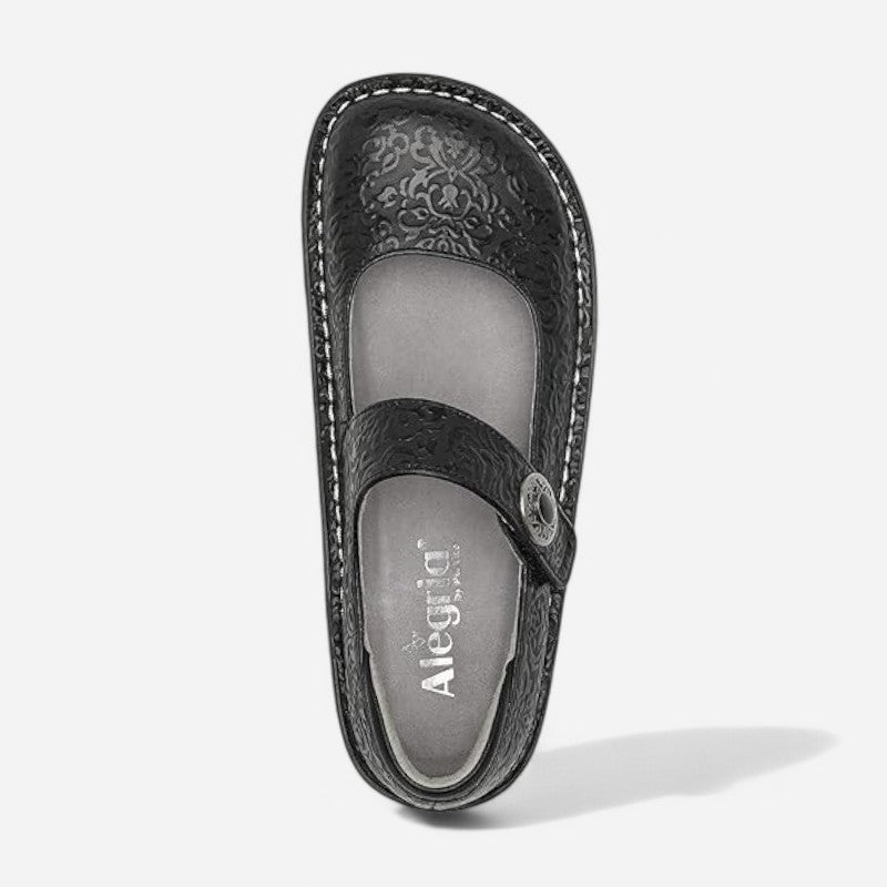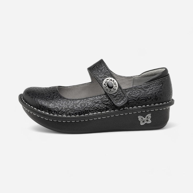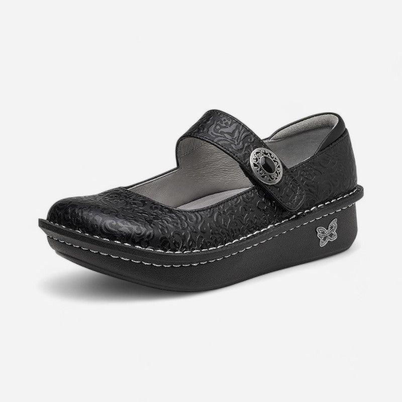 Our popular Mary Jane features an adjustable hook-and-loop close strap, each adorned with its own unique ornament. For added comfort and support, it incorporates an ergonomically designed memory foam and cork footbed that's easily removable with a classic rocker outsole that creates a natural rolling motion when walking.