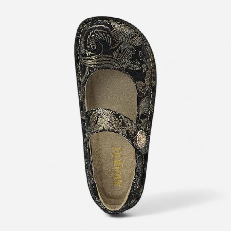 Our popular Mary Jane features an adjustable hook-and-loop close strap, each adorned with its own unique ornament. For added comfort and support, it incorporates an ergonomically designed memory foam and cork footbed that's easily removable with a classic rocker outsole that creates a natural rolling motion when walking.