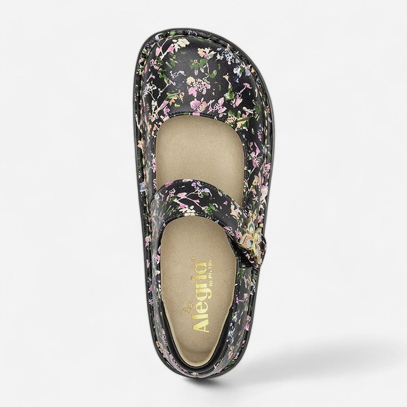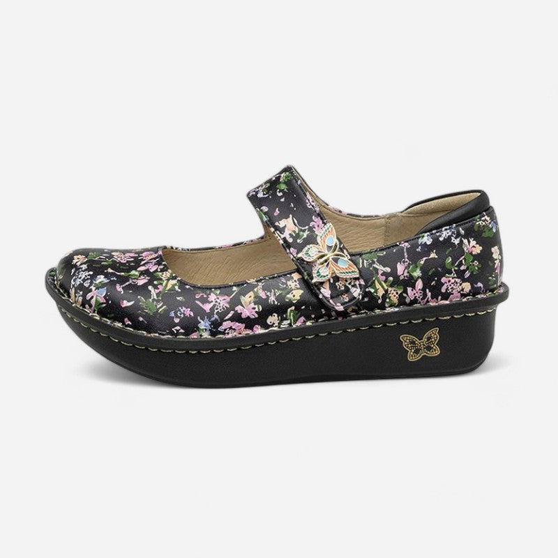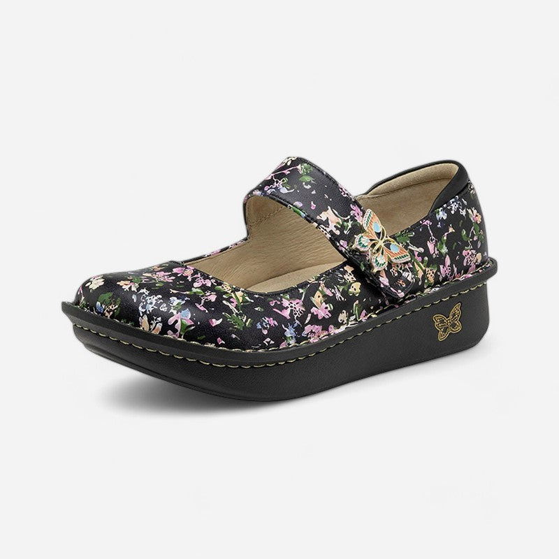 Our popular Mary Jane features an adjustable hook-and-loop close strap, each adorned with its own unique ornament. For added comfort and support, it incorporates an ergonomically designed memory foam and cork footbed that's easily removable with a classic rocker outsole that creates a natural rolling motion when walking.