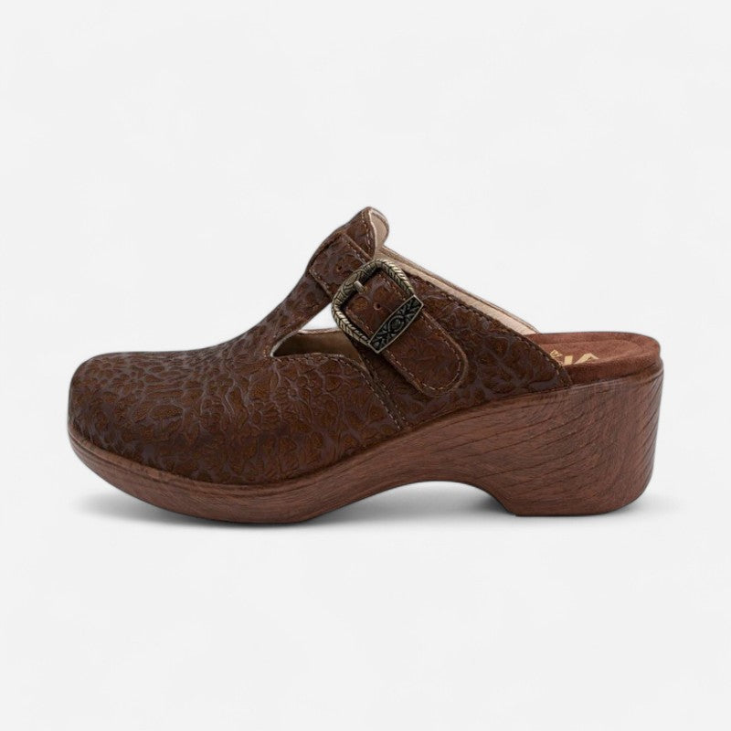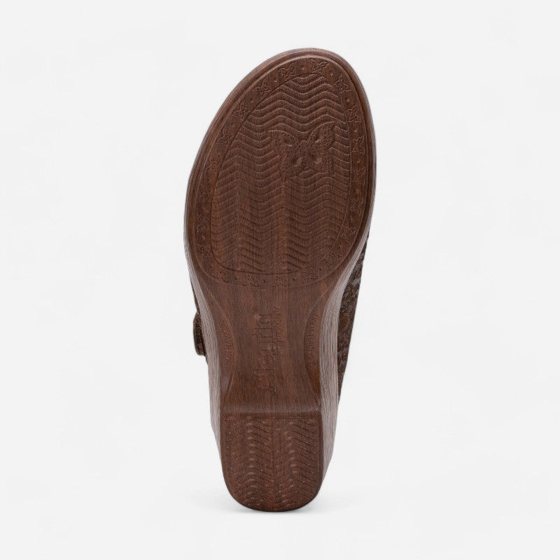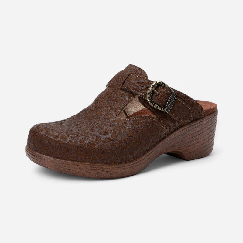 It's all about pattern power in this Selina wedge dressed up with an adjustable side buckle strap and lightweight slip-resistant Wood Look Wedge outsole. Built-in arch support and a gently cushioned footbed lined with soft microsuede provide an extra degree of underfoot comfort.