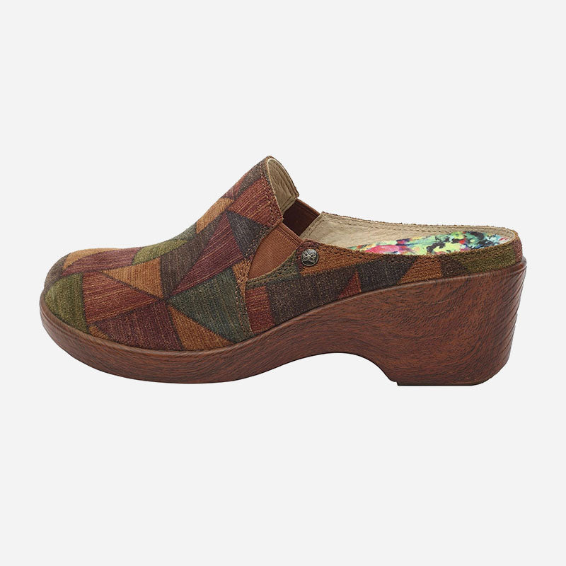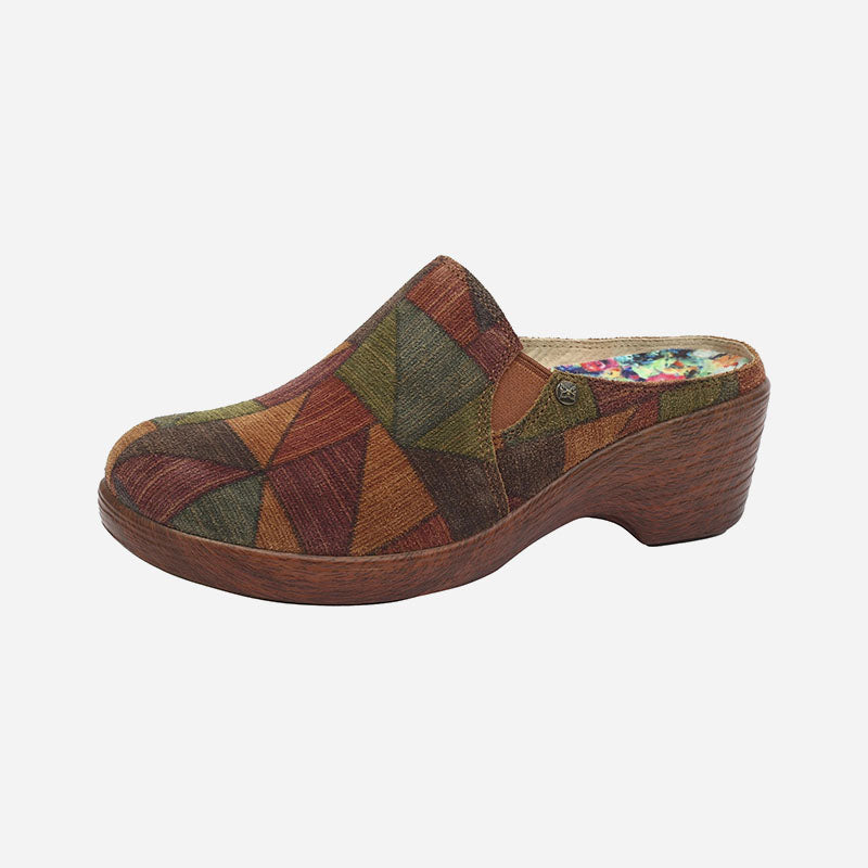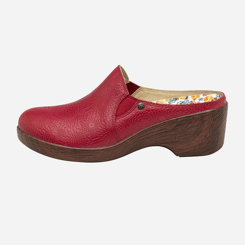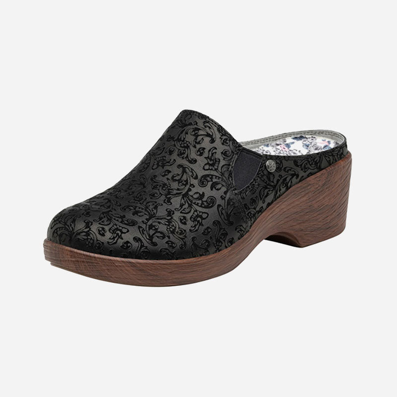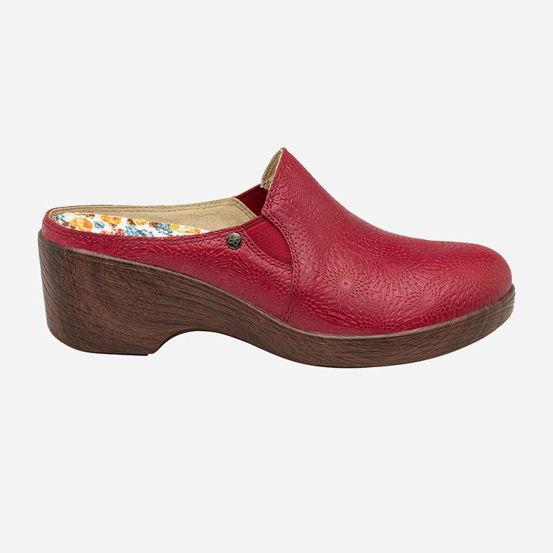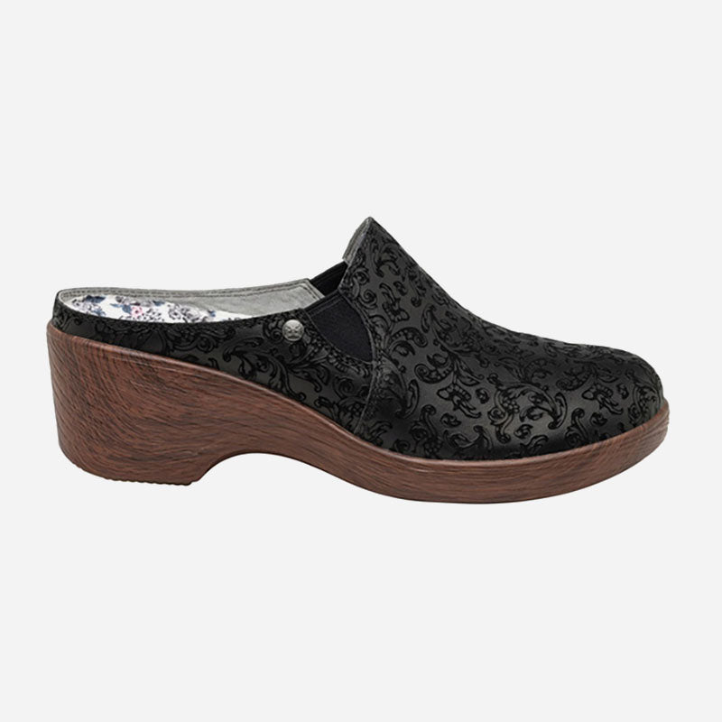 The Sereniti offers the timeless look of a traditional clog, complete with enhanced arch support for all day comfort. The subtle wedge gives added height without pressure on the ball of the foot. Rich supple leather enhances the overall aesthetics, allowing this shoe to transition seamlessly from work to leisure. The removable printed micro suede footbed adds an eye-popping detail.