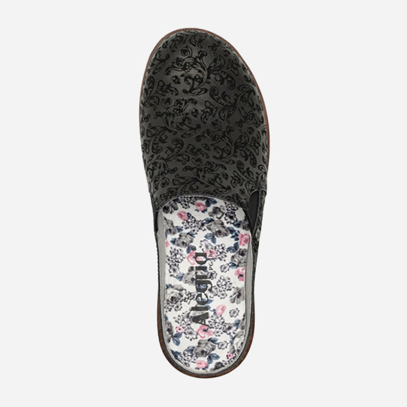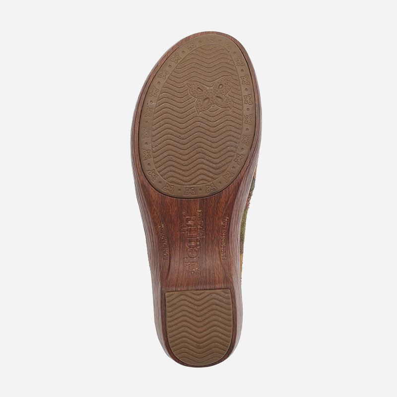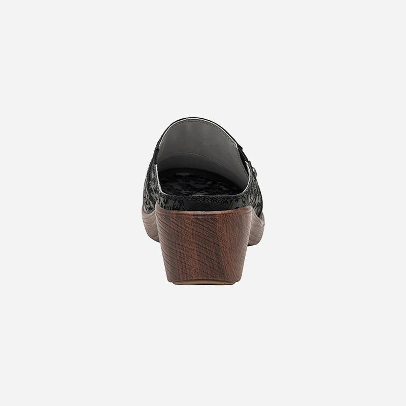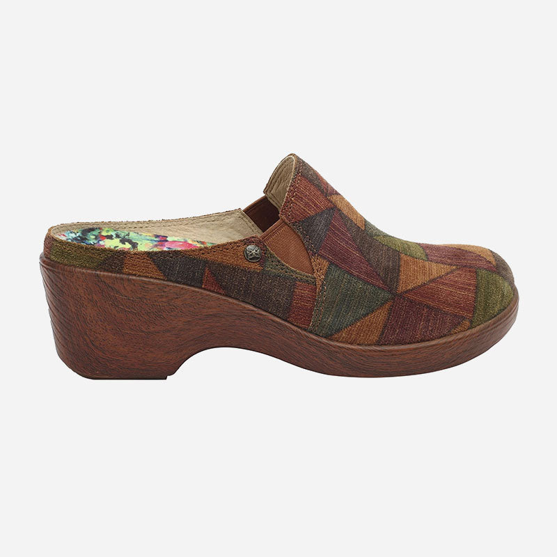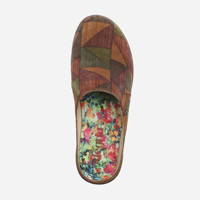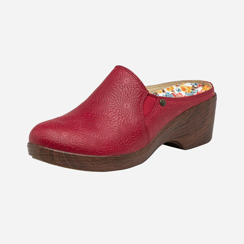 The Sereniti offers the timeless look of a traditional clog, complete with enhanced arch support for all day comfort. The subtle wedge gives added height without pressure on the ball of the foot. Rich supple leather enhances the overall aesthetics, allowing this shoe to transition seamlessly from work to leisure. The removable printed micro suede footbed adds an eye-popping detail.
