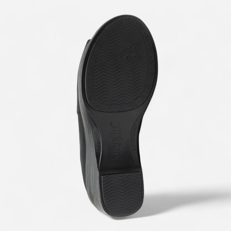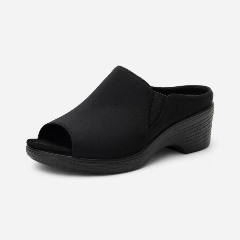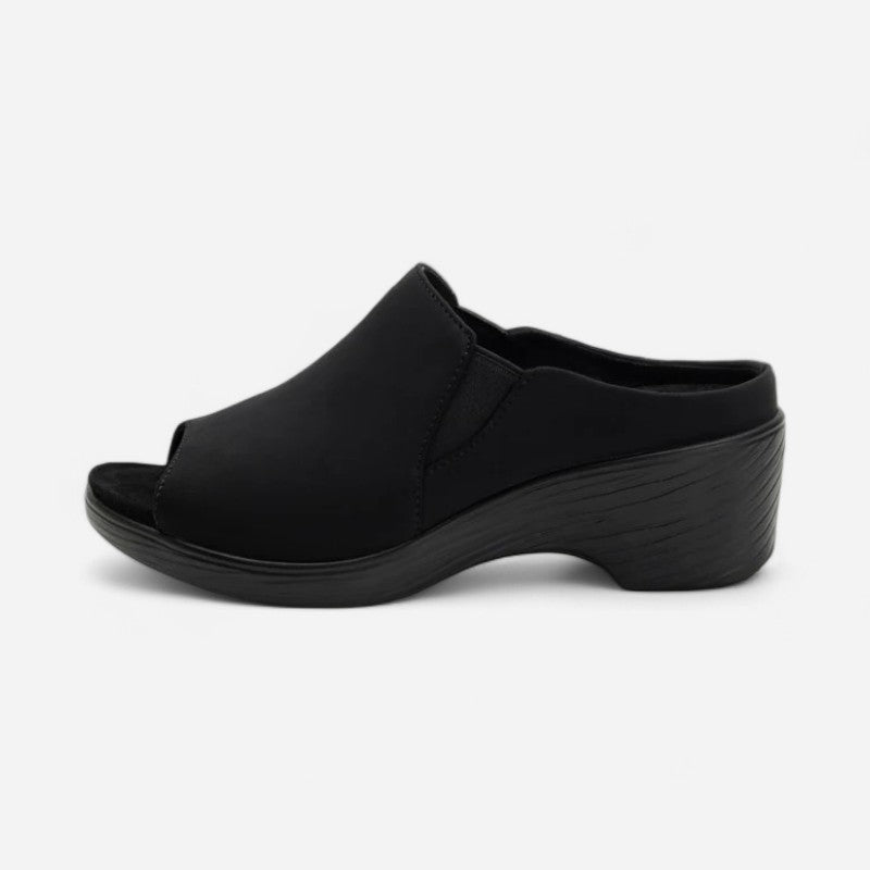 Think you know clogs, think again. This contemporary open-toe style is detailed in a micro suede stretch upper that gently hugs the foot. For added security on the go, there’s a subtle heel rim that holds the foot in place and stretchy side gore. Hidden inside is a contoured memory foam and cork footbed set into a featherweight wood look wedge outsole.