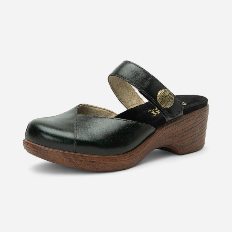 Retro dressing isĀ reinventedĀ in this Sydni, a 60's-inspired leather clog detailed with a convenient hook-and-loop close strap. A contoured footbed fits neatly into a slip-resistant featherweight wood look wedge outsole.