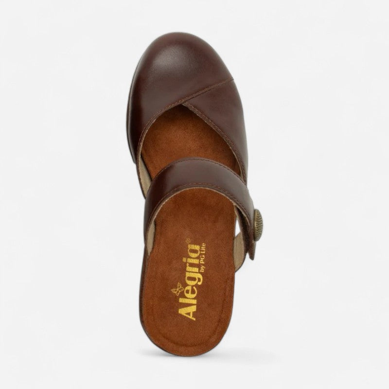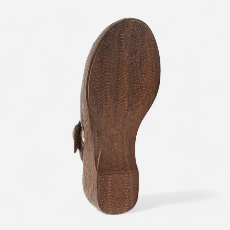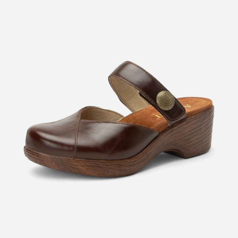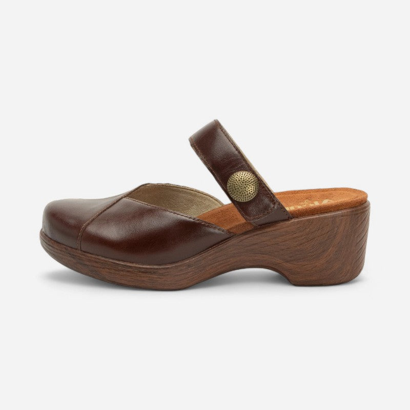 Retro dressing isĀ reinventedĀ in this Sydni, a 60's-inspired leather clog detailed with a convenient hook-and-loop close strap. A contoured footbed fits neatly into a slip-resistant featherweight wood look wedge outsole.