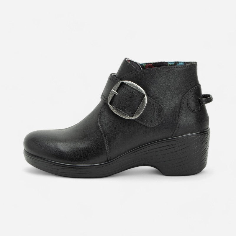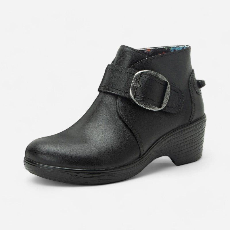 This leather ankle boot with a convenient back pull tab is detailed with a lightweight wood-look slip-resistant wedge. It features an adjustable hook-and-loop strap finished off with a bold metal buckle. The removable suede-lined footbed is made of polyurethane, cork and memory foam.