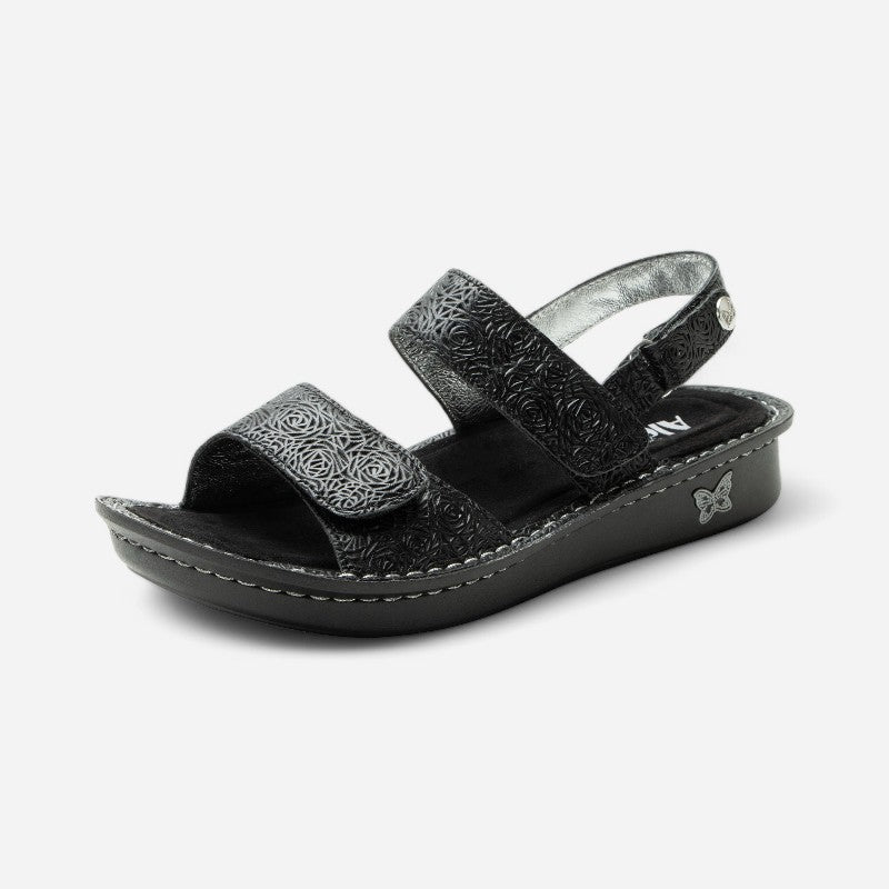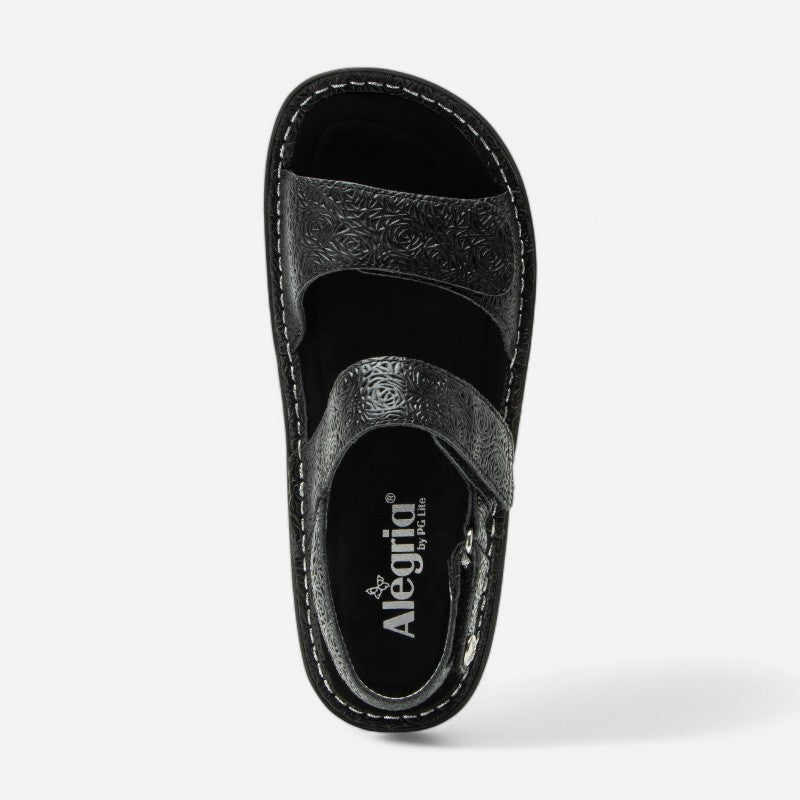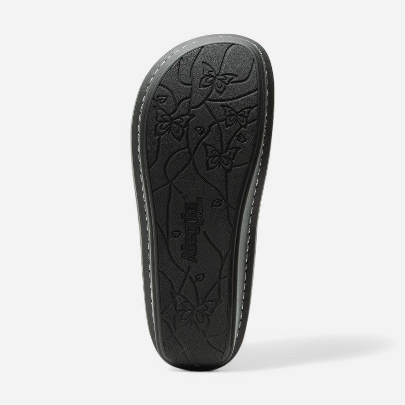 The Verona is on our Mini outsole and is paired with our patented footbed for a truly comfortable fit. The mini-rocker outsole is constructed to mimic a natural rocking motion for improved pressure distribution across the bottom of the foot. The footbed is ergonomically designed to conform the natural contour of the foot, working to relieve legs, hip and back from long standing hours. Three adjustable closures allows for a customized fit to accommodate your feet perfectly. Featured in an Inky colorway on a lazer etched leather upper.
