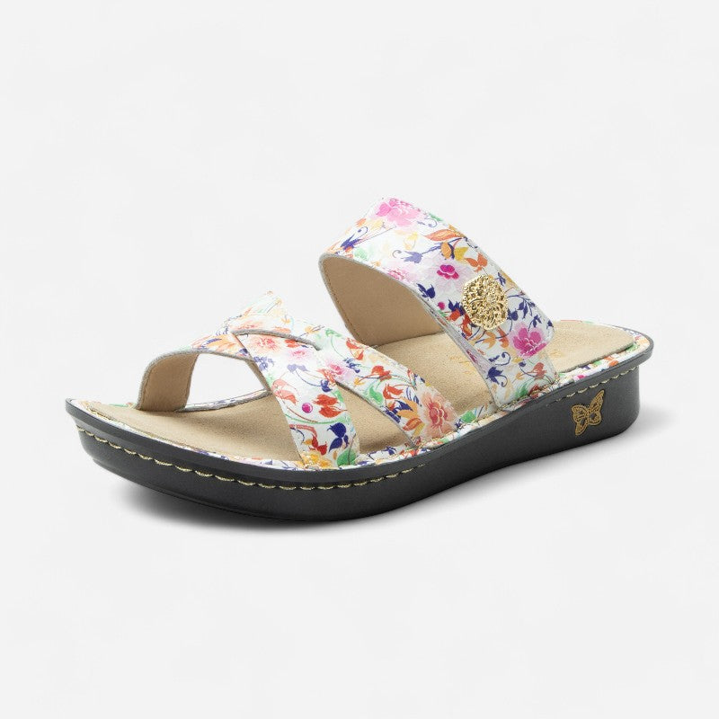 Casual meets regal. The Victoriah is the perfect slide sandal to glamorize any summer outfit. Sumptuous patterns and complementary metallic hardware create an intricate look. An adjustable strap and a crisscross design over the vamp are paired with our slimmer Mini outsole, designed to mimic a natural rocking motion for improved pressure distribution across the bottom of the foot. The patented footbed is ergonomically designed to conform the natural contour of the foot, working to relieve legs, hip and back from long standing hours.