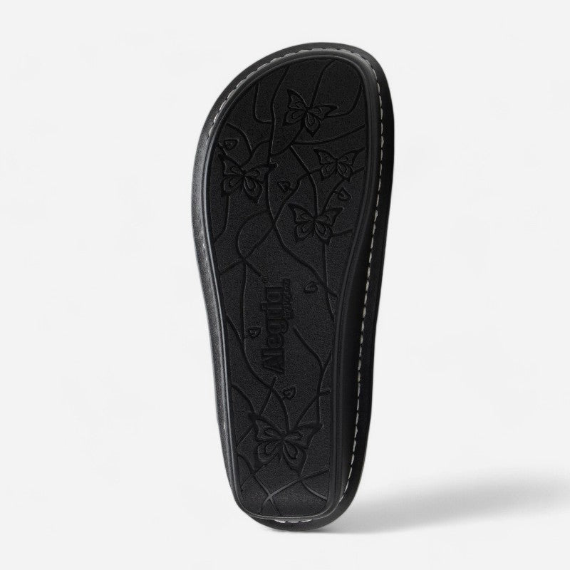 The Verona is on our Mini outsole and is paired with our patented footbed for a truly comfortable fit. The mini-rocker outsole is constructed to mimic a natural rocking motion for improved pressure distribution across the bottom of the foot. The footbed is ergonomically designed to conform the natural contour of the foot, working to relieve legs, hip and back from long standing hours. Three adjustable closures allows for a customized fit to accommodate your feet perfectly. Featured in an Inky colorway on a lazer etched leather upper.