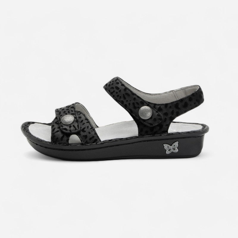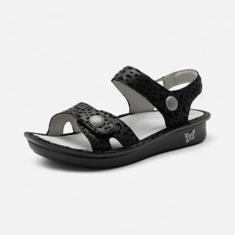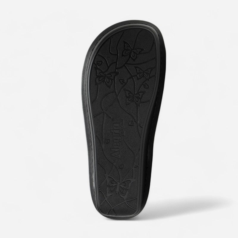 The Verona is on our Mini outsole and is paired with our patented footbed for a truly comfortable fit. The mini-rocker outsole is constructed to mimic a natural rocking motion for improved pressure distribution across the bottom of the foot. The footbed is ergonomically designed to conform the natural contour of the foot, working to relieve legs, hip and back from long standing hours. Three adjustable closures allows for a customized fit to accommodate your feet perfectly. Featured in an Inky colorway on a lazer etched leather upper.