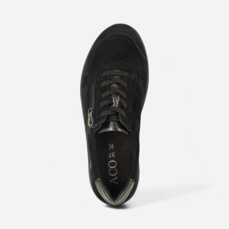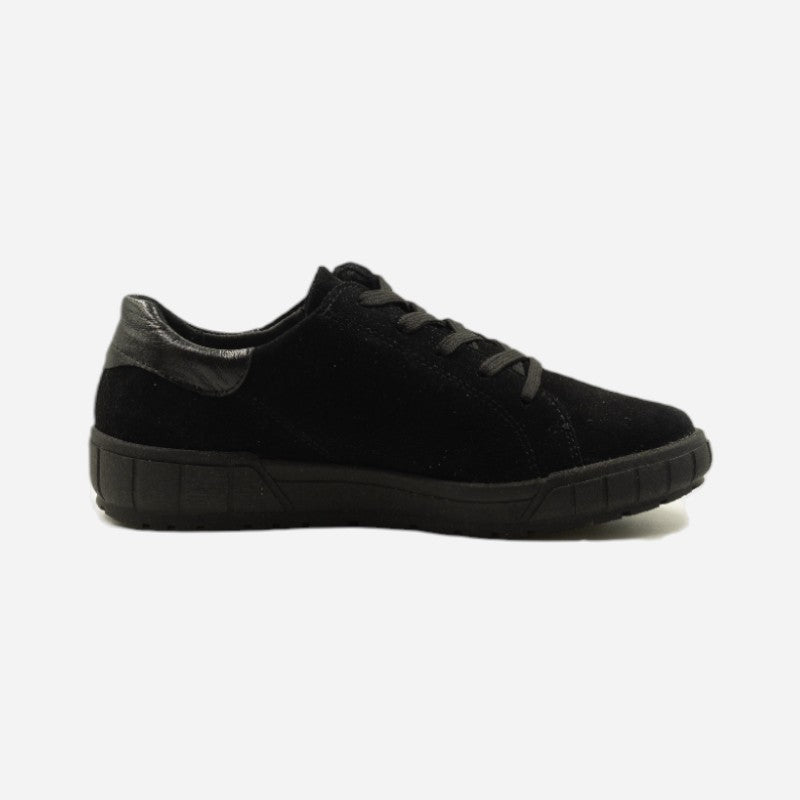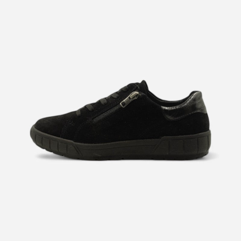 A suede side-zip sneaker with a leather-accented heel collar and sleek outsole.