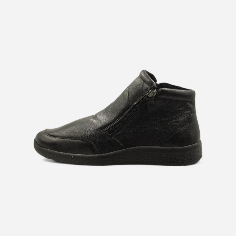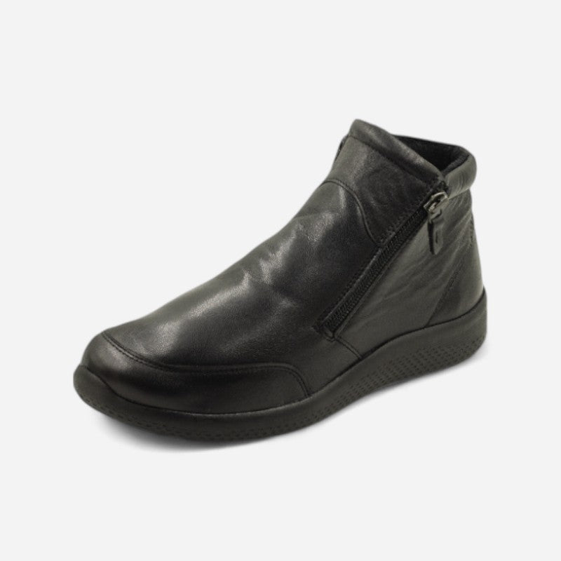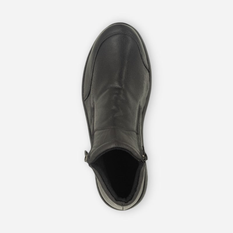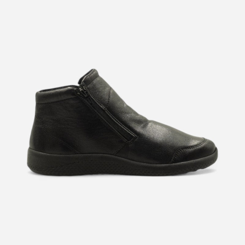 A soft and elegant basic leather bootie designed for streamlined, ankle-supporting walkability.