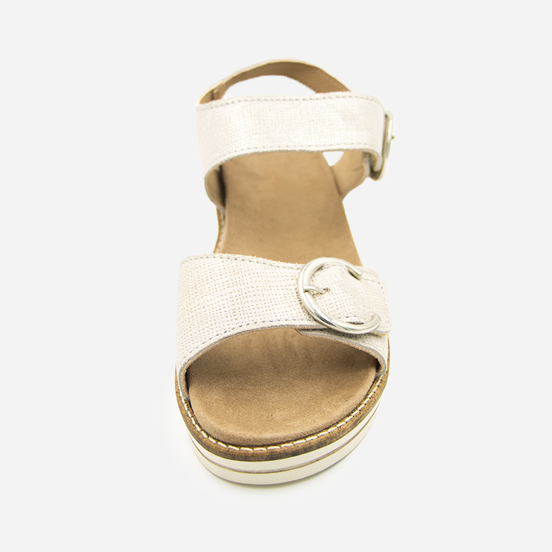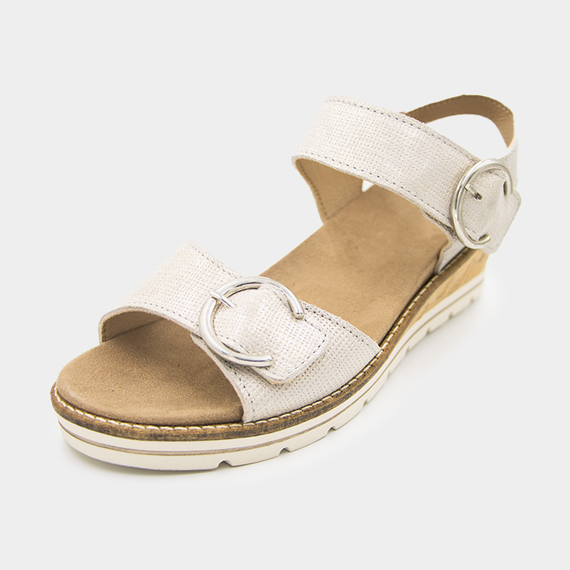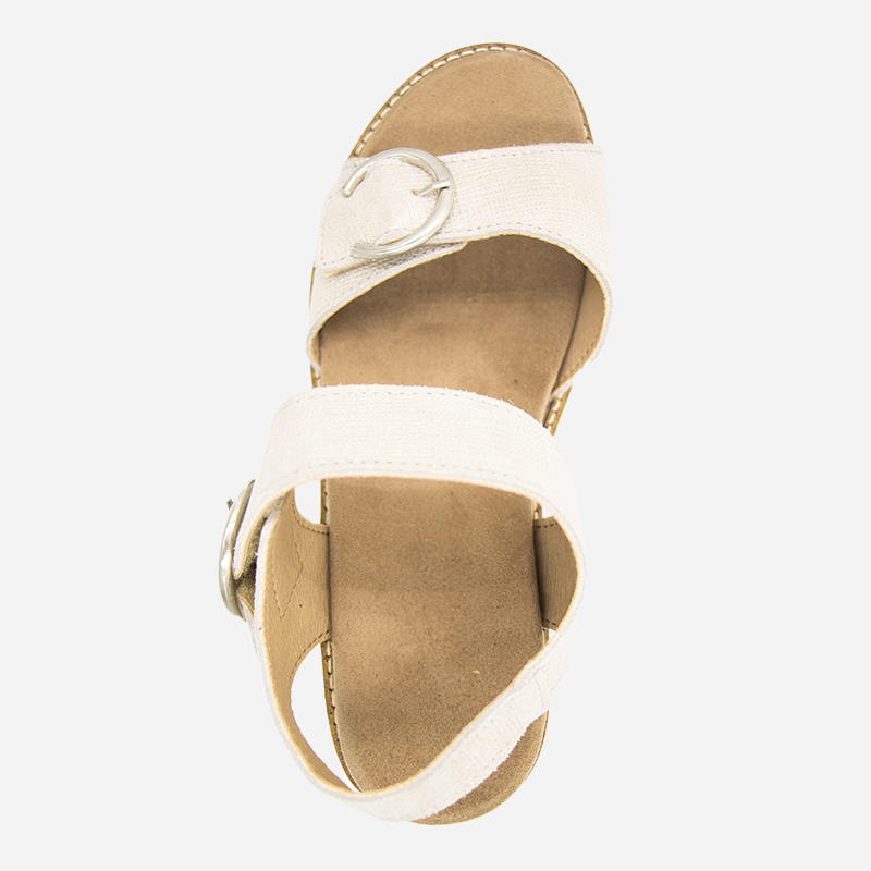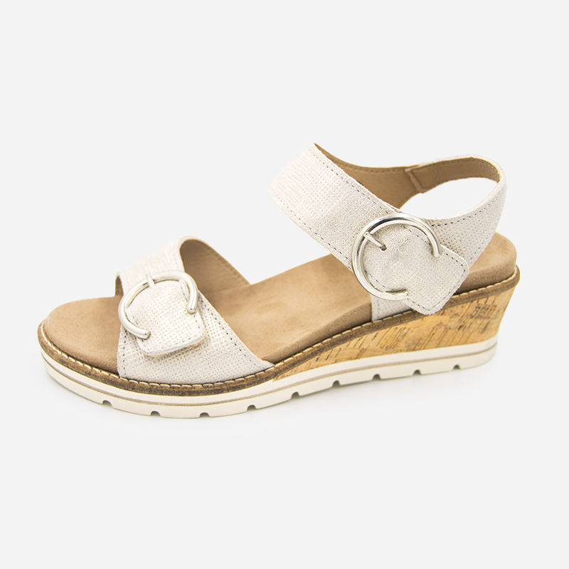 A lovely nubuck wedge sandal with sturdy hook-and-loop straps that adjust at the toebox and ankle for the perfect fit.