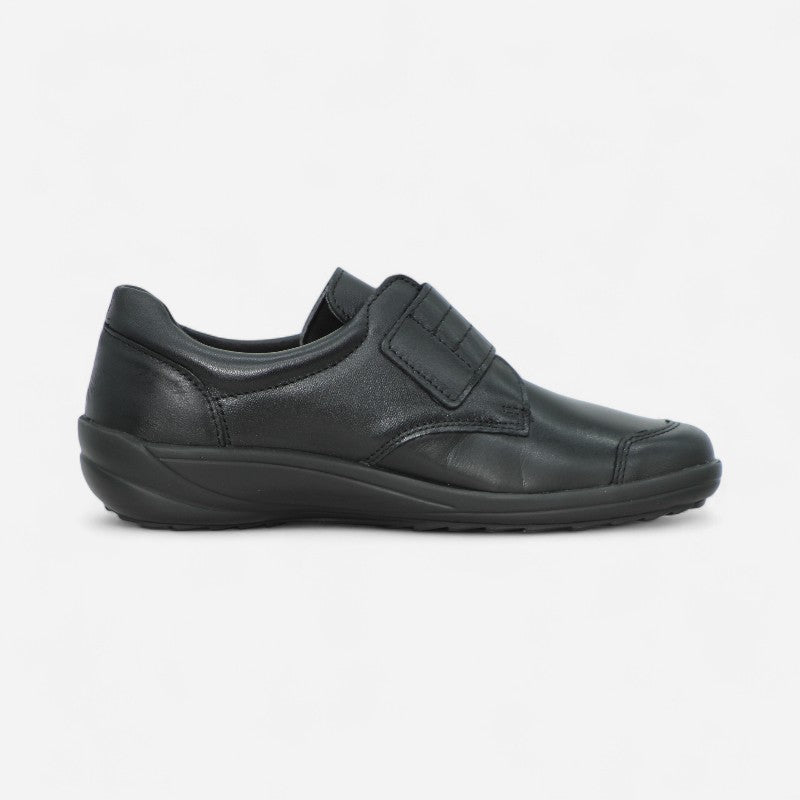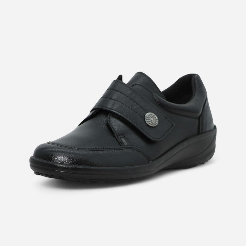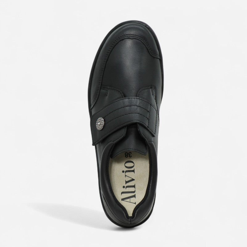 A foot-cradling, grippy-soled leather sneaker that adjusts at the instep for added stability with an attractive button acccent.