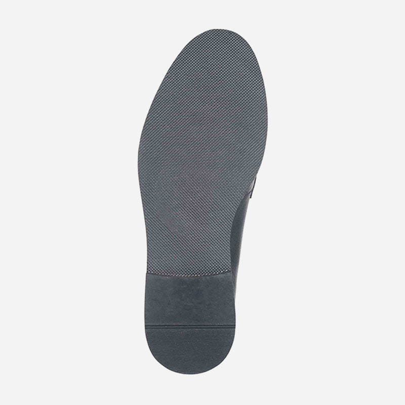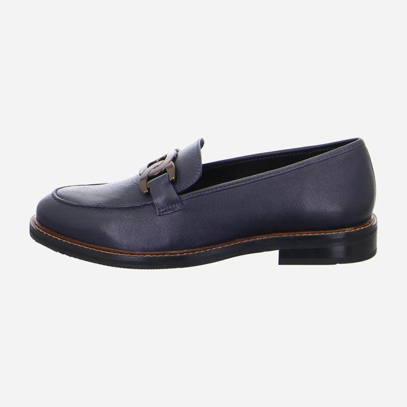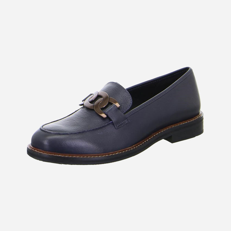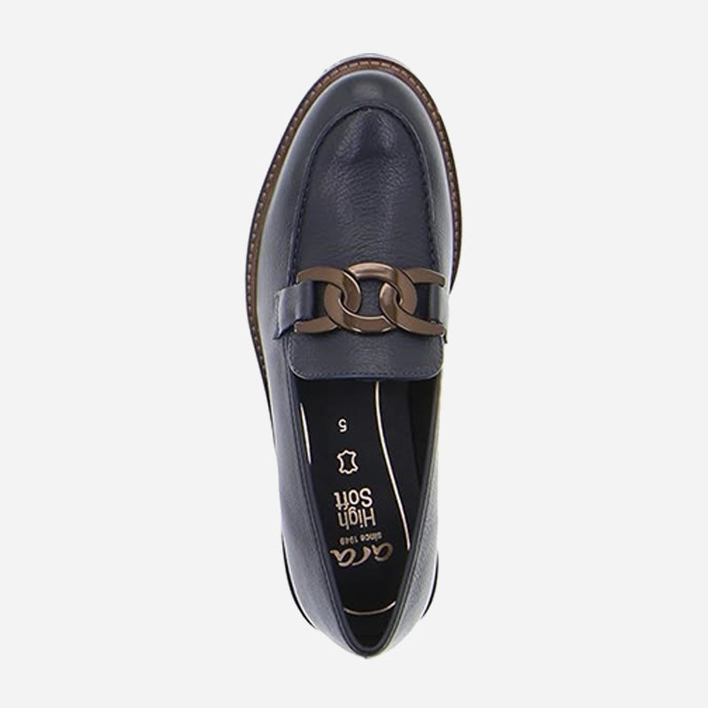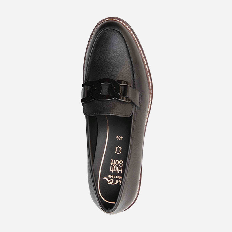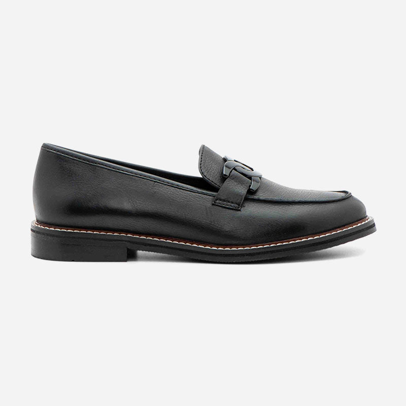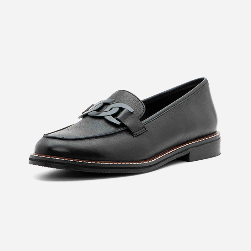 - A chunky chain accents a sophisticated loafer crafted from glossy leather and set on a cushioned footbed with arch support.