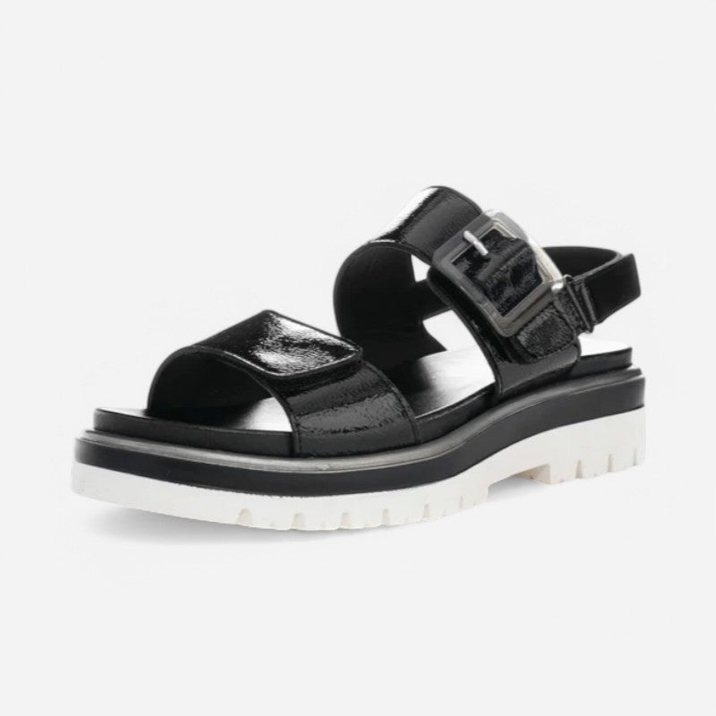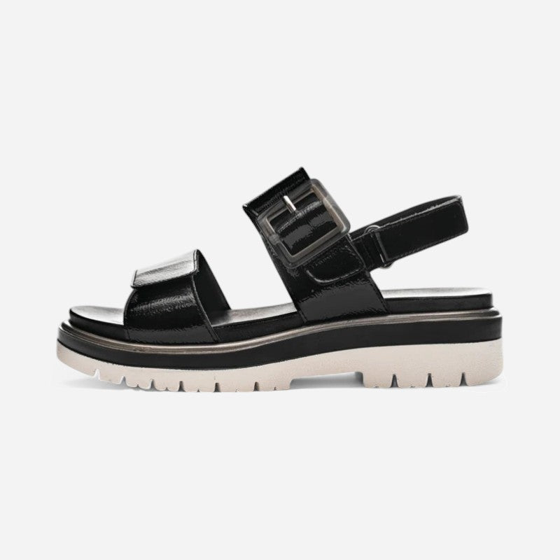 - Adjustable strap with buckle closure; adjustable slingback strap with hook-and-loop closure