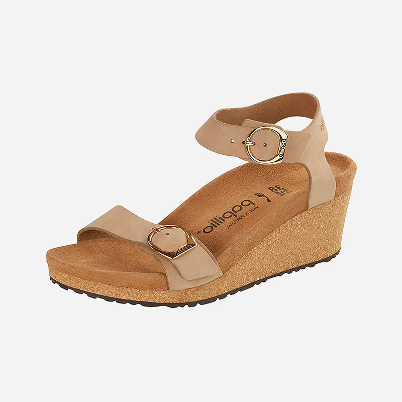 The Soley is a classic wedge heel sandal from Papillio. The Soley is the perfect combination of style and comfort, with its simple design and sleek heel strap. The delicate circular buckles are an elegant eye-catcher to dress up any outfit. The upper is made from high-quality, nubuck leather.