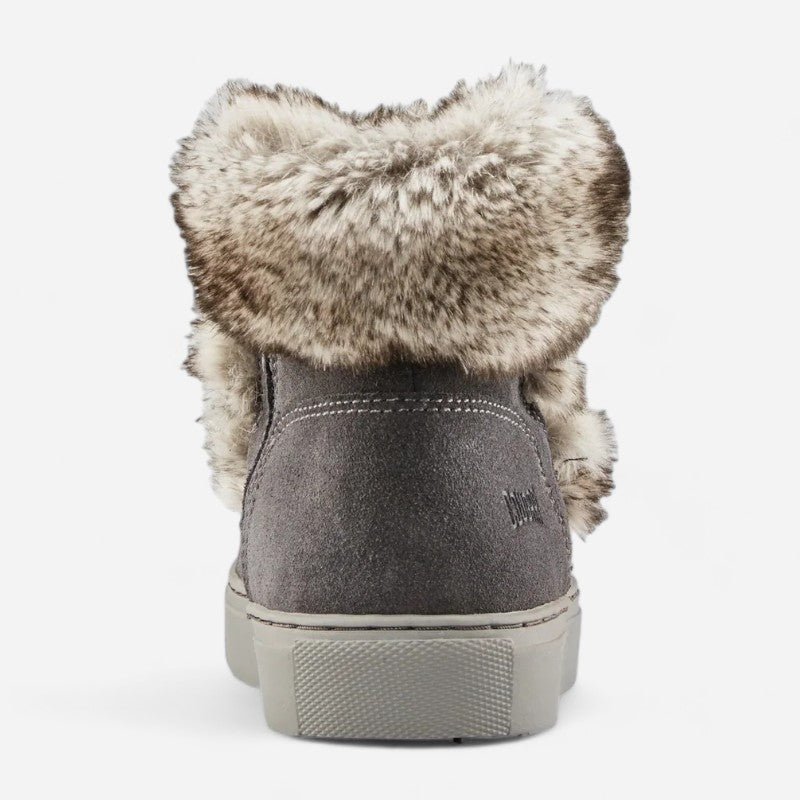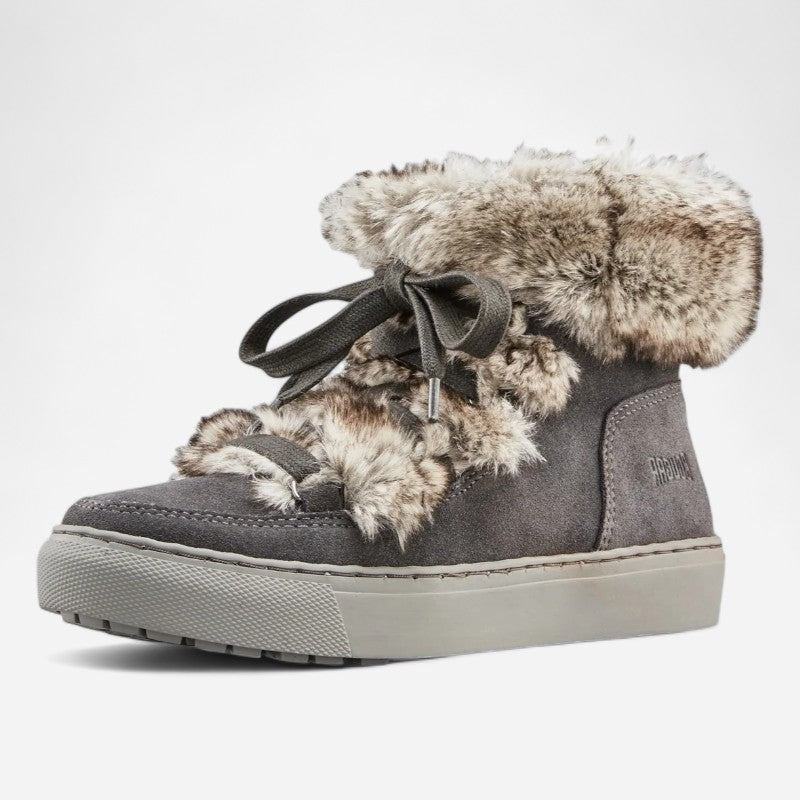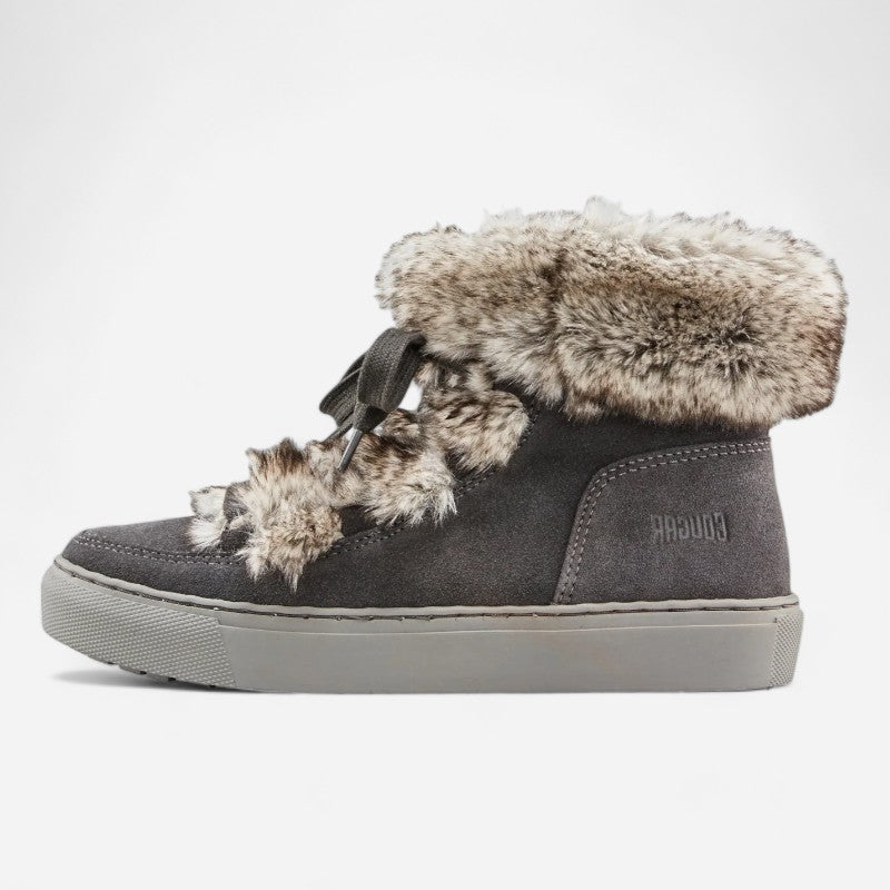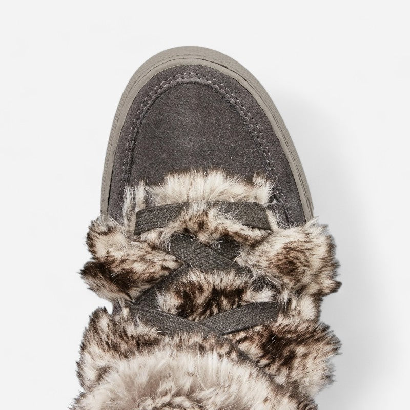 Ankle-height suede winter sneaker. Rounded toe. Faux fur collar and tongue detail. Inside zip closure with lace front. Tonal hardware and self stitching. Rubber outsole.