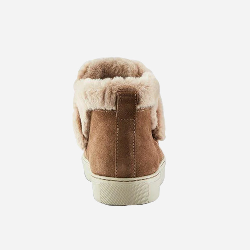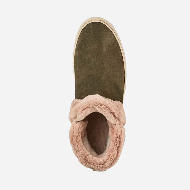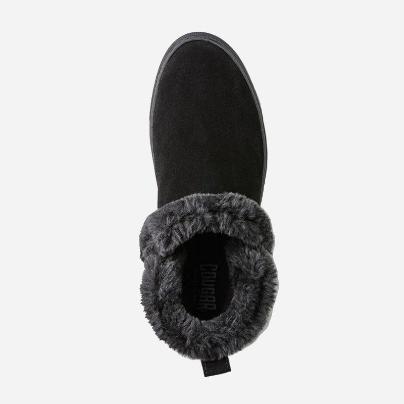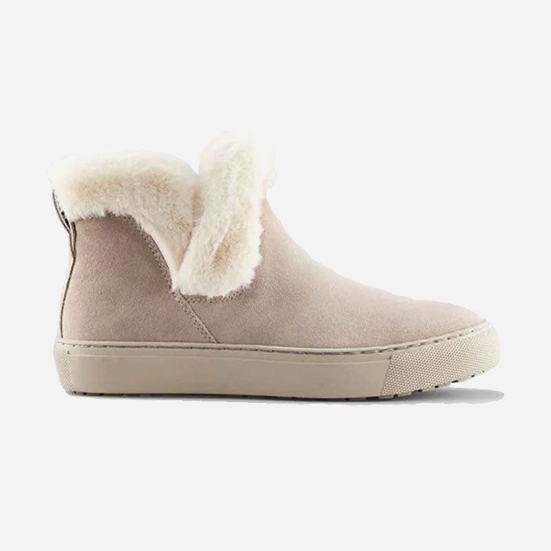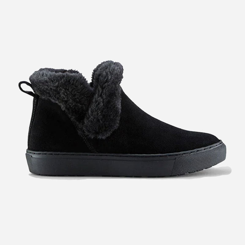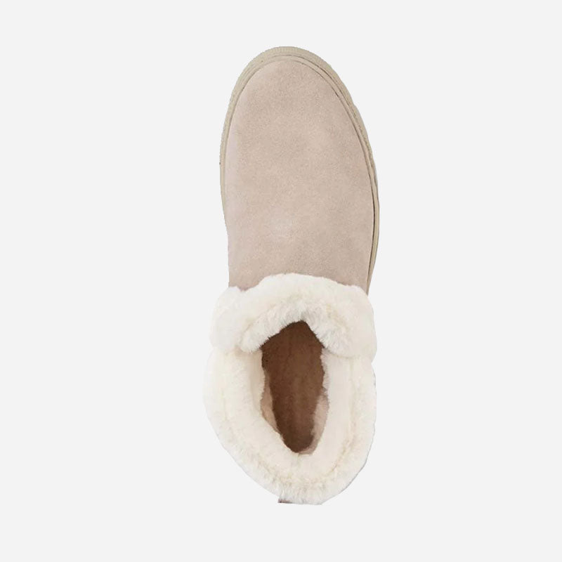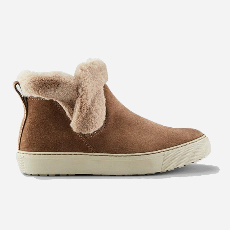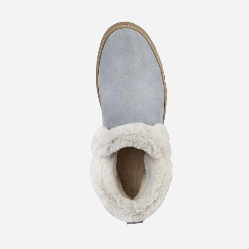 Ankle-height suede pull-on booties. Rounded toe. Faux lapin fur collar. Self stitching. Rubber outsole.
