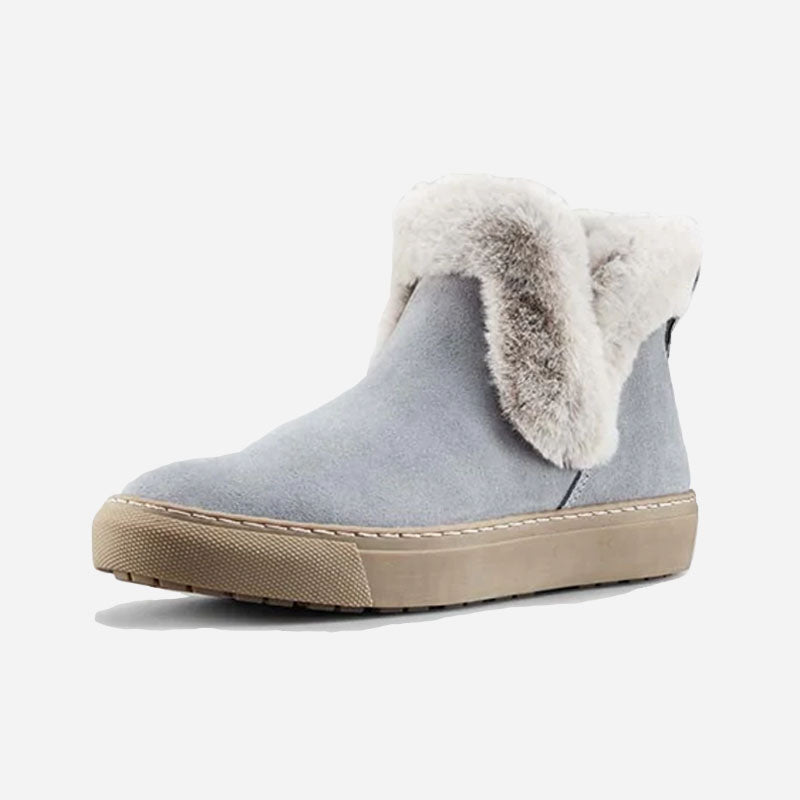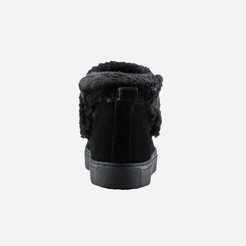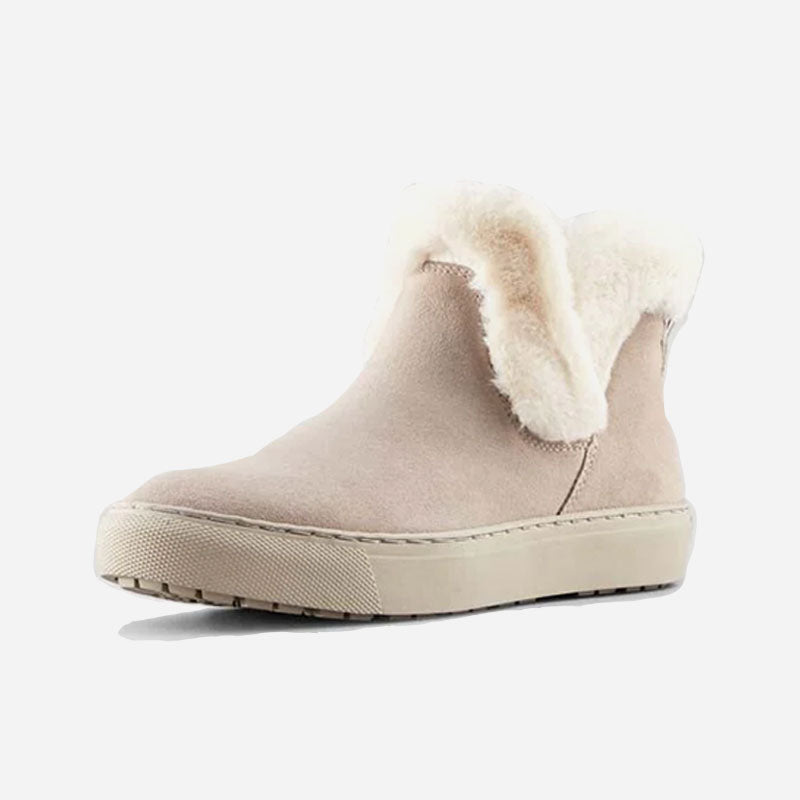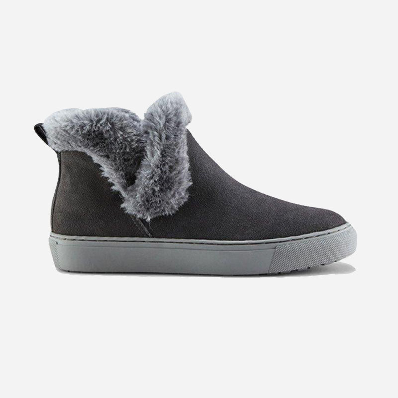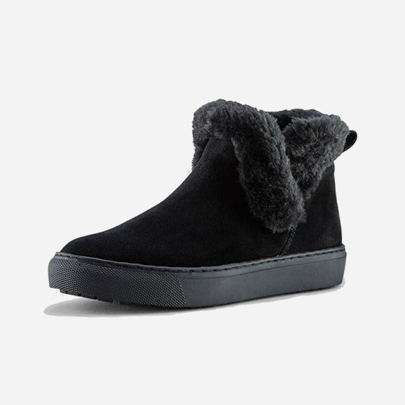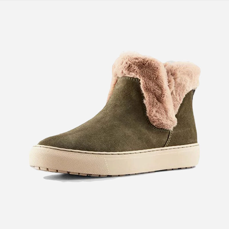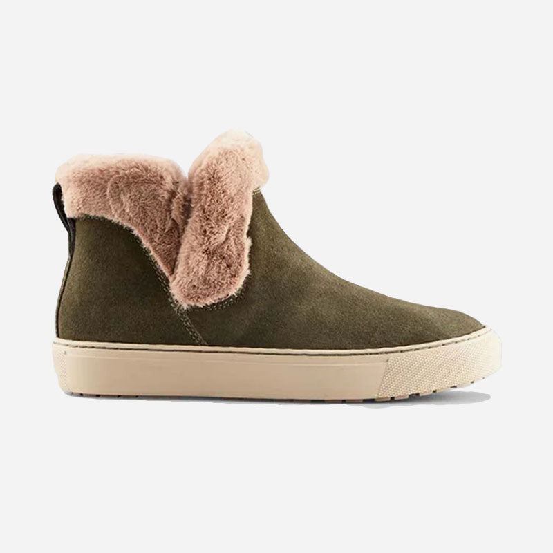 Ankle-height suede pull-on booties. Rounded toe. Faux lapin fur collar. Self stitching. Rubber outsole.