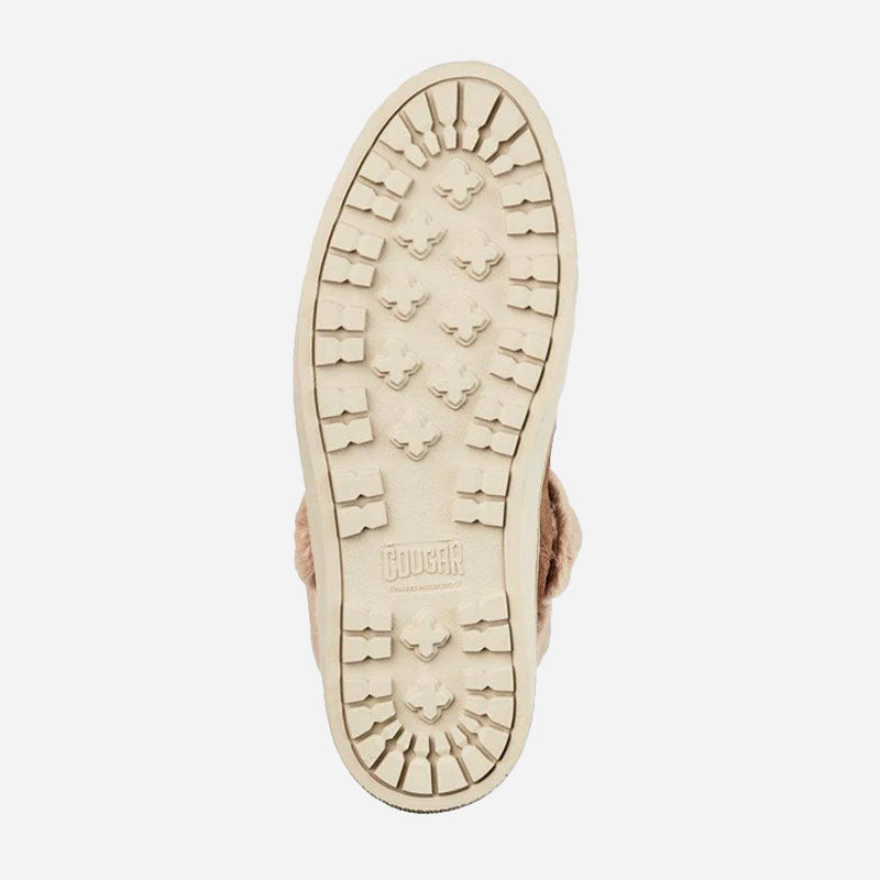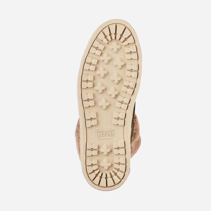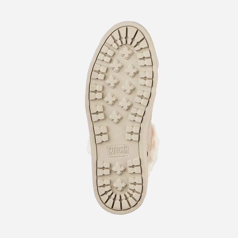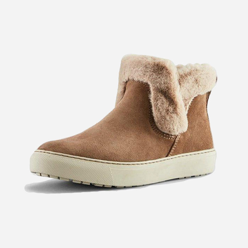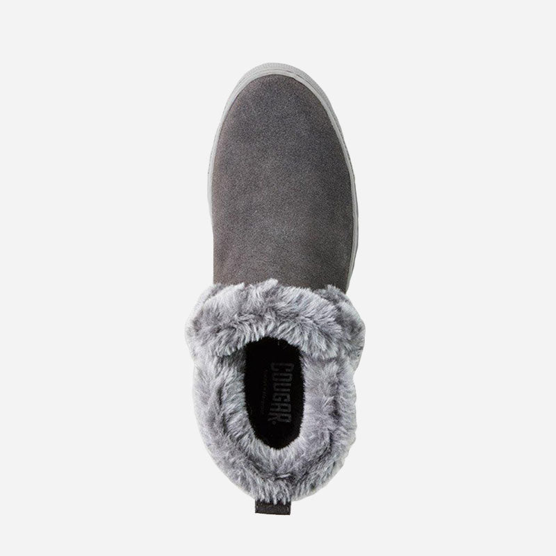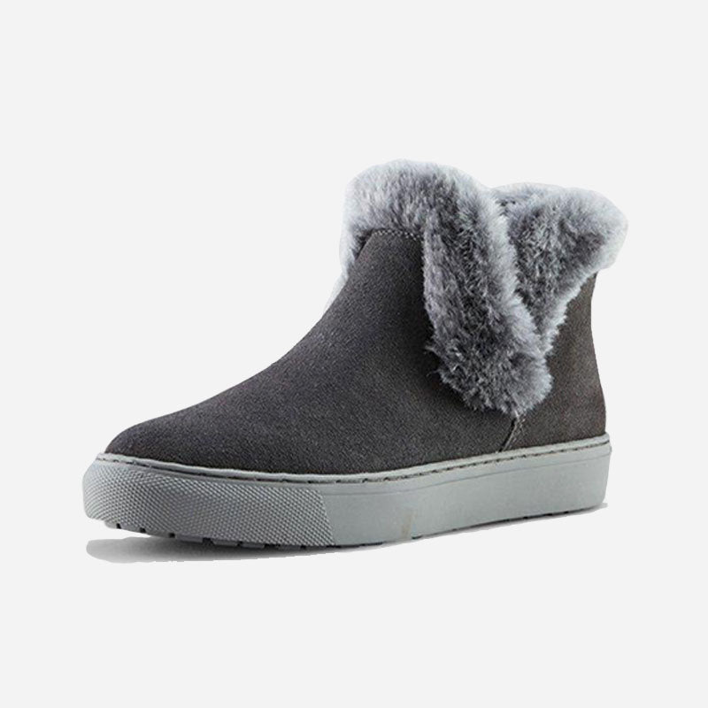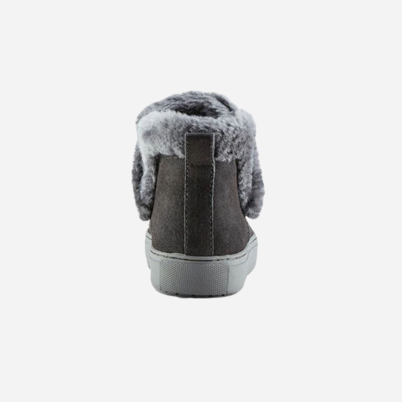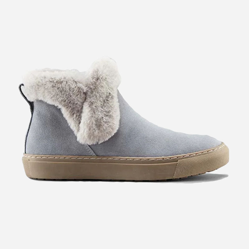 Ankle-height suede pull-on booties. Rounded toe. Faux lapin fur collar. Self stitching. Rubber outsole.