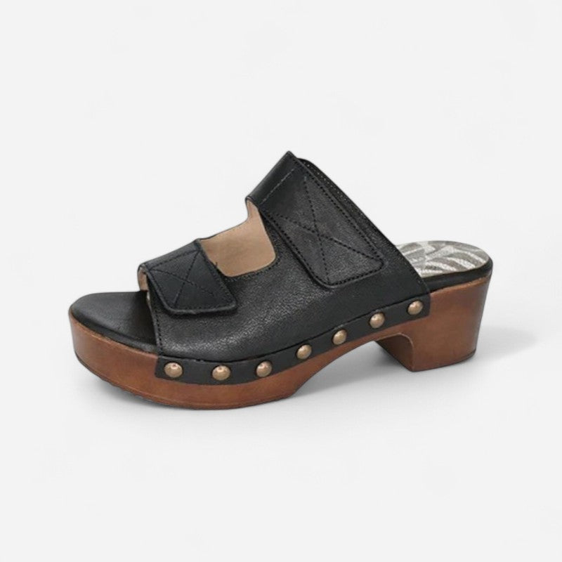Capture the stapled clog trend with a sandal! The Brea Black Leather Wedge features excellent cushioning with 2 soft leather straps with velcro that hugs your feet comfortably all day.