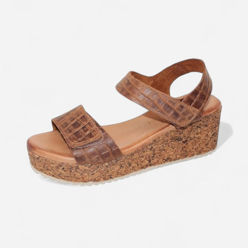 The Eric Michael Cleo is a comfortable and fashionable platform wedge sandal infused with glamour. The Cleo sandal is handcrafted with a leather upper and a fun cork midsole trim for a stylish look.