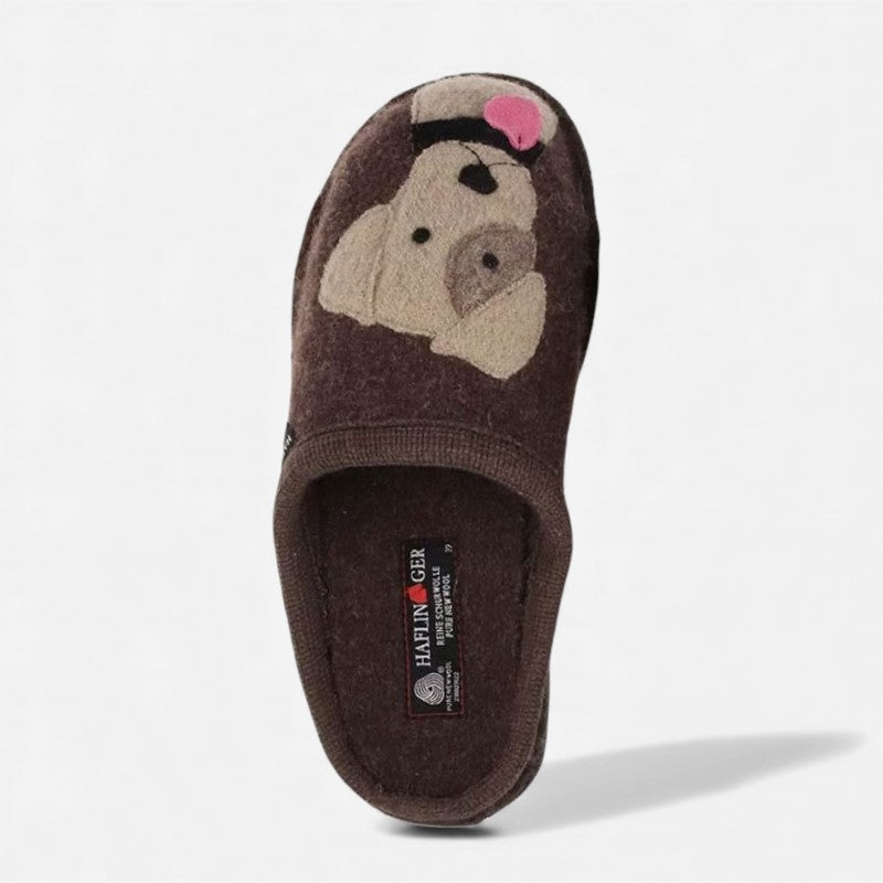 Cozy comfort for your feet: The Haflinger Slipper AR Rudi features a premium 100% boiled wool upper—soft, breathable, and wonderfully warm. The adorable dog applique adds a playful, charming touch, while the non-slip felt sole ensures safe footing on any surface. Perfect for relaxing moments at home.