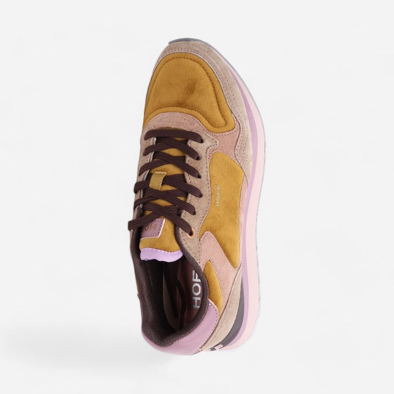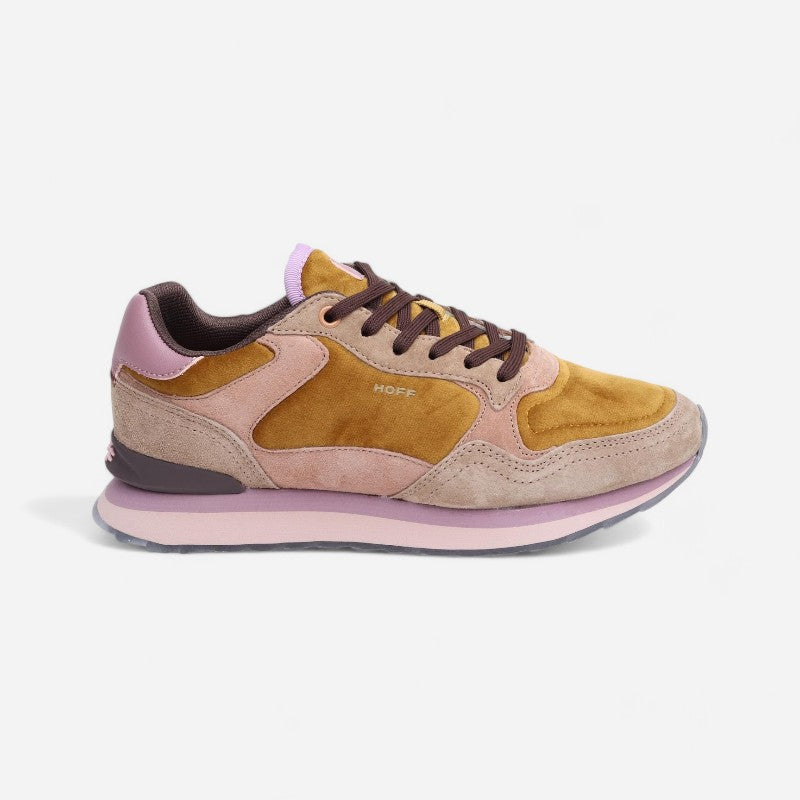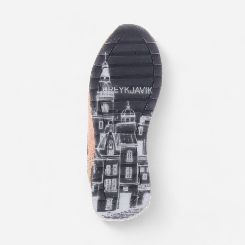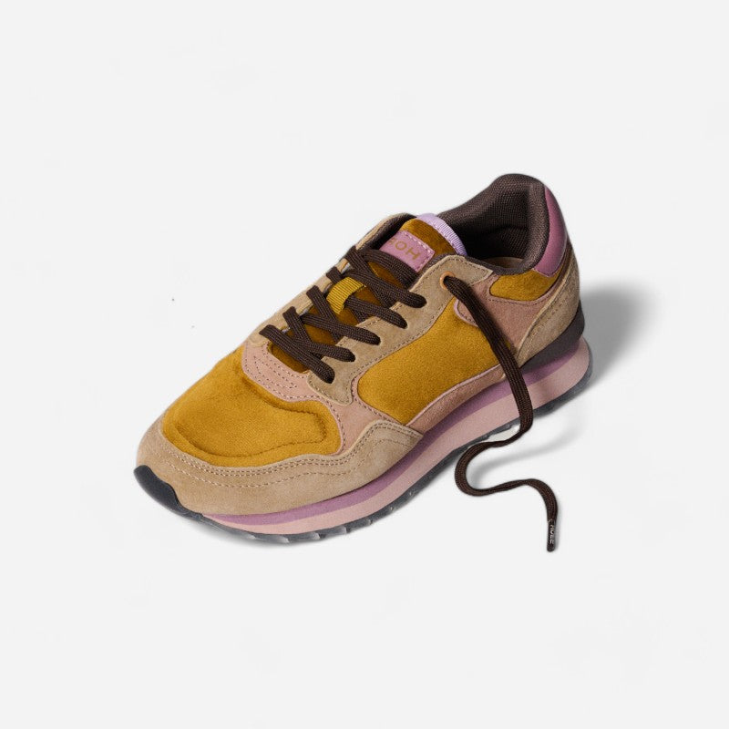 Elegant and modern, the Reikiavik sneakers are an expression of style and versatility. Their design combines split leather in shades of khaki, mustard and pale pink, highlighted with lilac details, offering a unique and sophisticated look. The Memory Foam (R) insole ensures a perfect fit and cushioned feel.