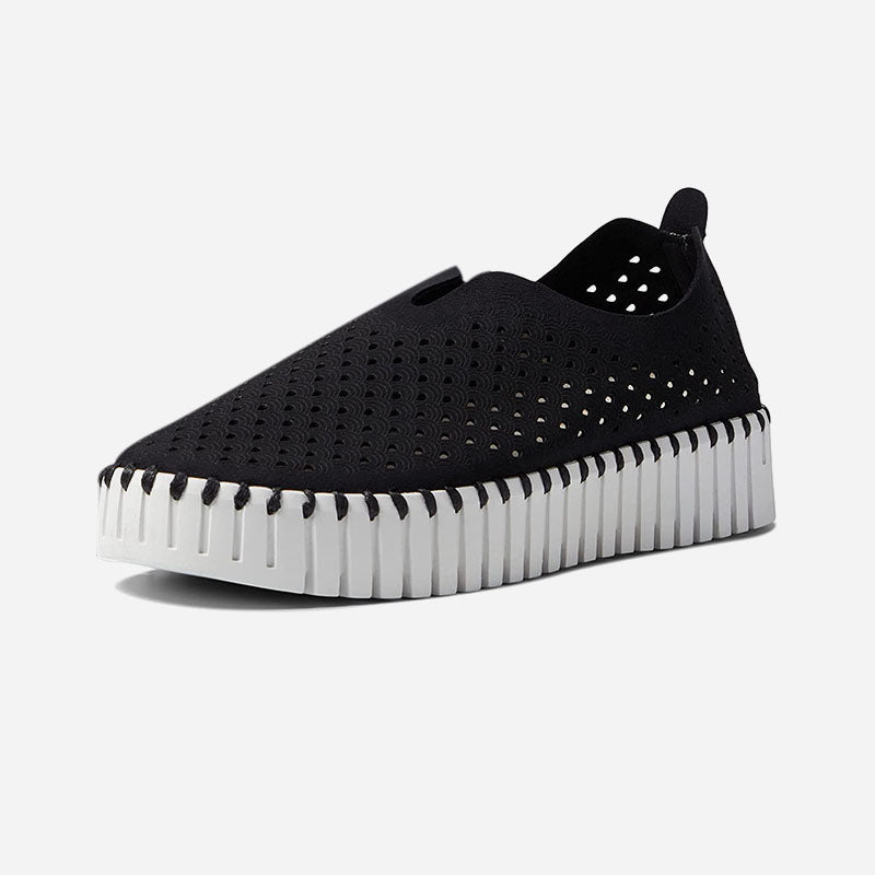 The Ilse Jacobsen Women's Tulip Flats 3373 have a revolutionary design. Crafted with recycled microfiber, they feature a decorative laser-cut pattern and iconic Tulip outsole made from 75% natural and 25% recycled rubber and sewn with recycled thread. The pig-suede lined insole ensures your feet stay comfortable all day.