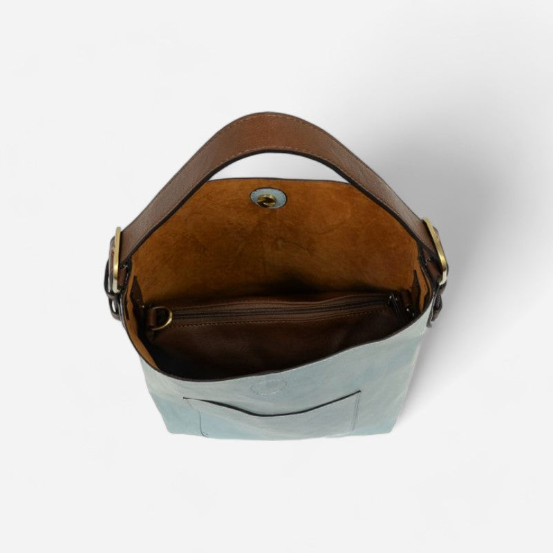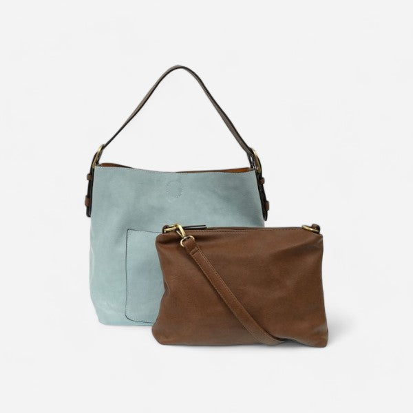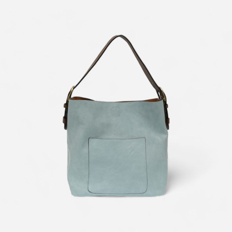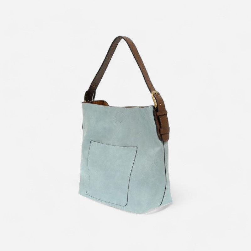 Equally timeless and modern, our best-selling classic hobo is made in rich vegan leather in beautiful colors always accented with neutral straps.  This roomy bag accented with a large front pocket and a snap-in removable crossbody, has plenty of room to carry your needs in style.