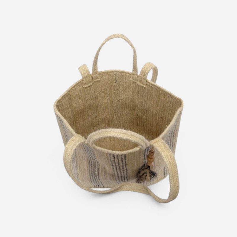 You’ll be whisked away to the islands with this market tote in gently sun washed colors of tonal stitched stripes. Soft natural jute fibers are braided together to form this beautiful bag.