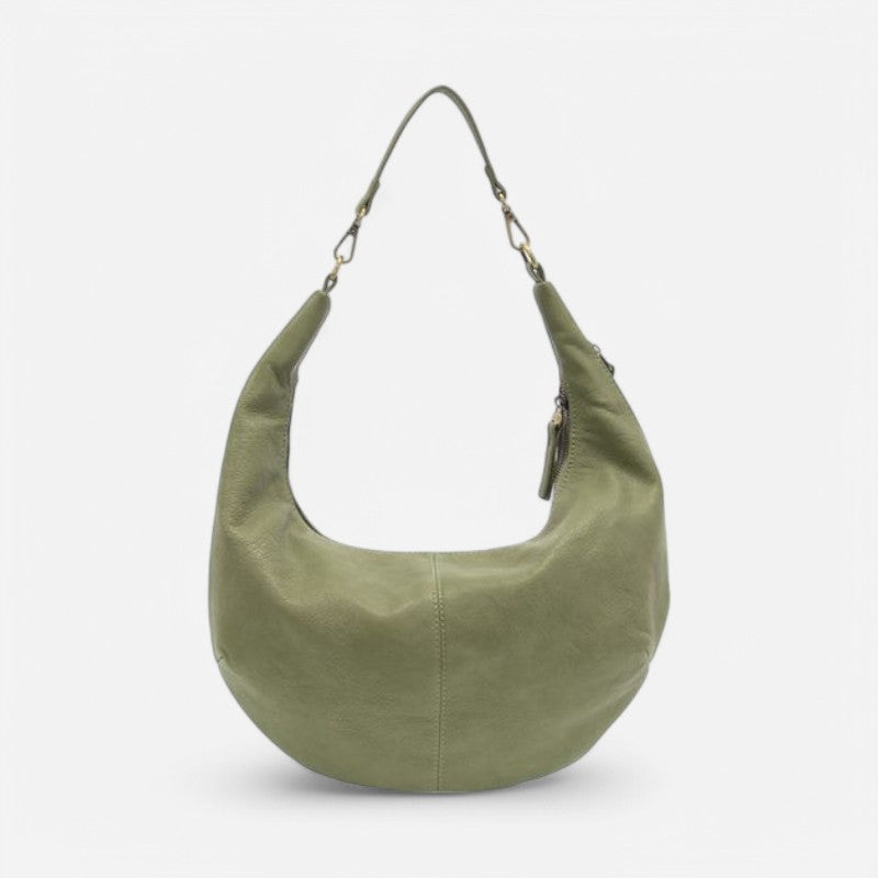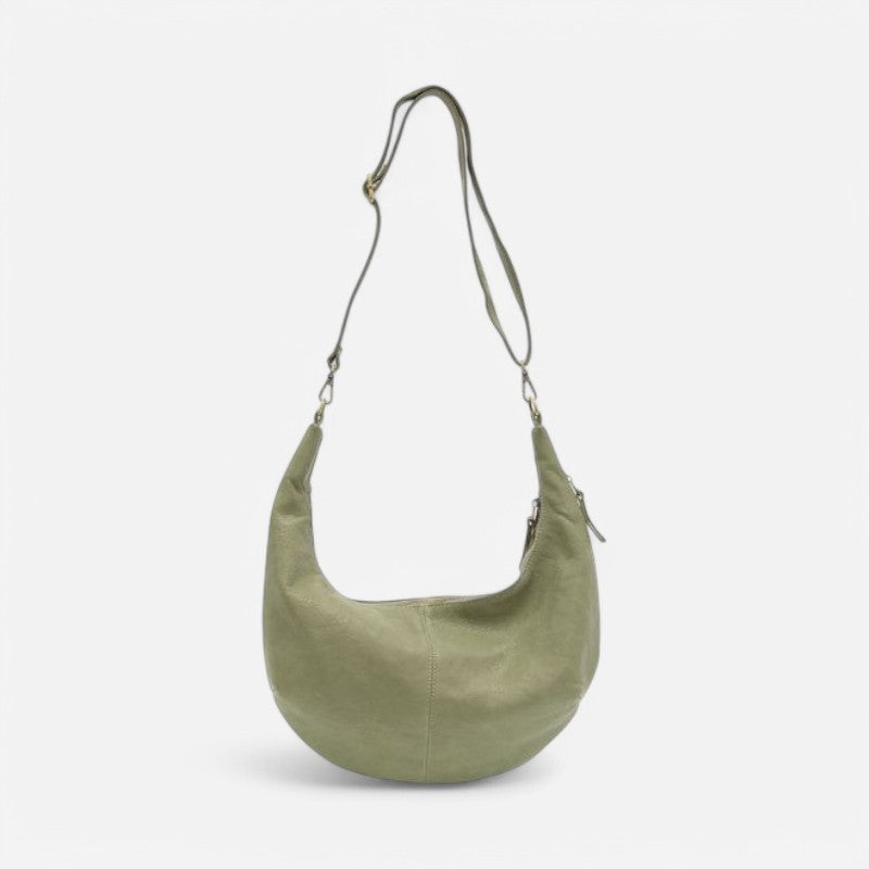 This relaxed and slouchy crescent shape hobo crafted in tumbled vegan leather is on trend and so easy to wear with 2 versatile straps, one short and one adjustable long so you can wear as a short shoulder or a crossbody.