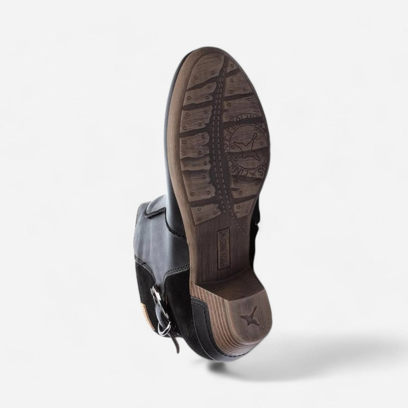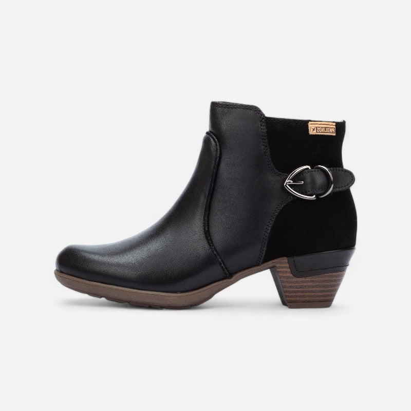 Rotterdam is one of the brand’s most iconic lines, with a very flexible, lightweight sole and 5 cm (2") heel with leather detail. The upper is packed with personality and provides good coverage, with a padded insole and non-slip sole. These ankle boots, with a metal zipper on the inside to make them easy to get off and on, also have a decorative buckle on the outside. And the plain vamp highlights the unique Pikolinos finishes.