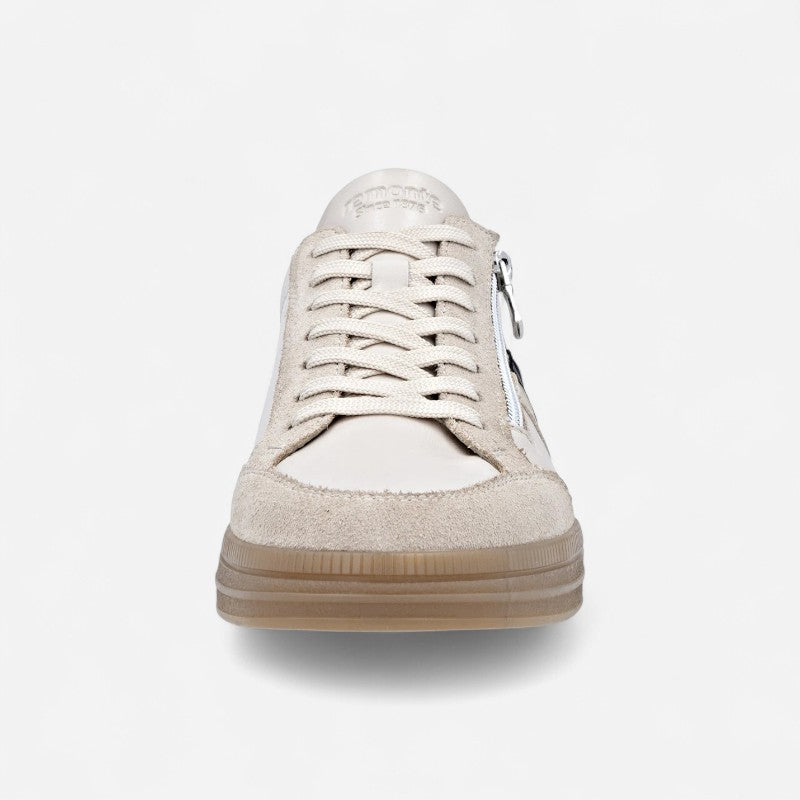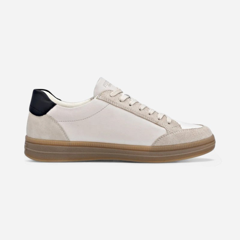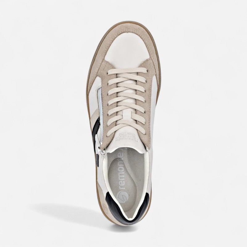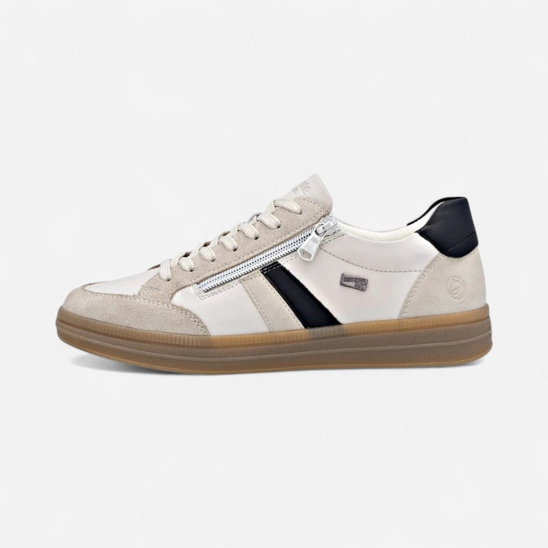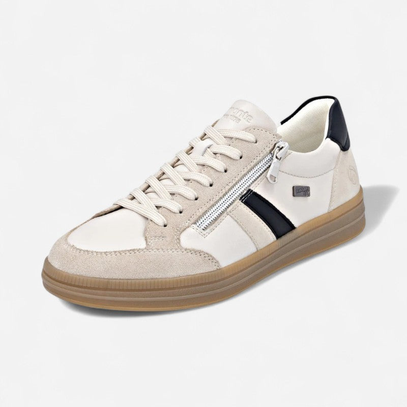 Keep it classy! With these remonte low-top sneakers made of smooth leather are a real eye-catcher! The lacing complements the zipper for functionality and comfort. The grippy and cushioning sole, together with the padded and removable insole, creates a pleasant feeling underfoot. Furthermore, the comfort width offers your feet more freedom of movement in the forefoot area. Thanks to the remonteTEX technology, the shoe is water-repellent and offers protection from the wind. Grab it, girls!