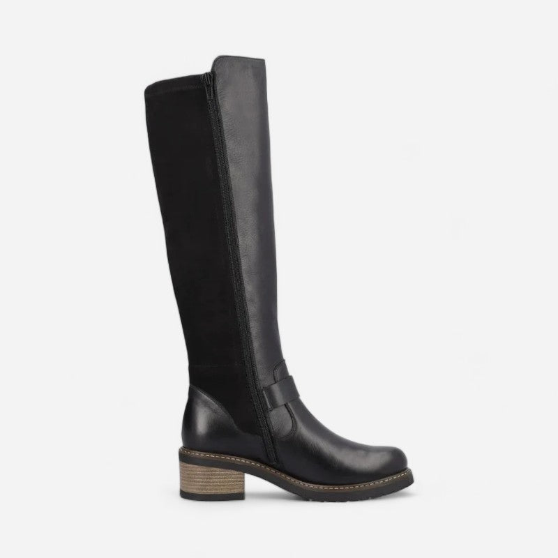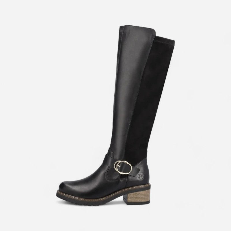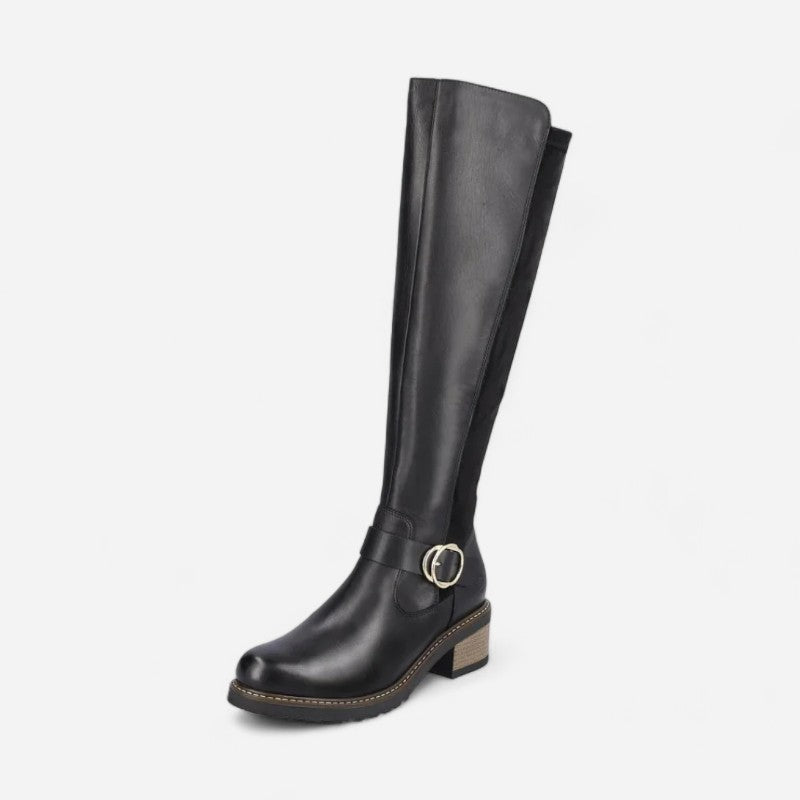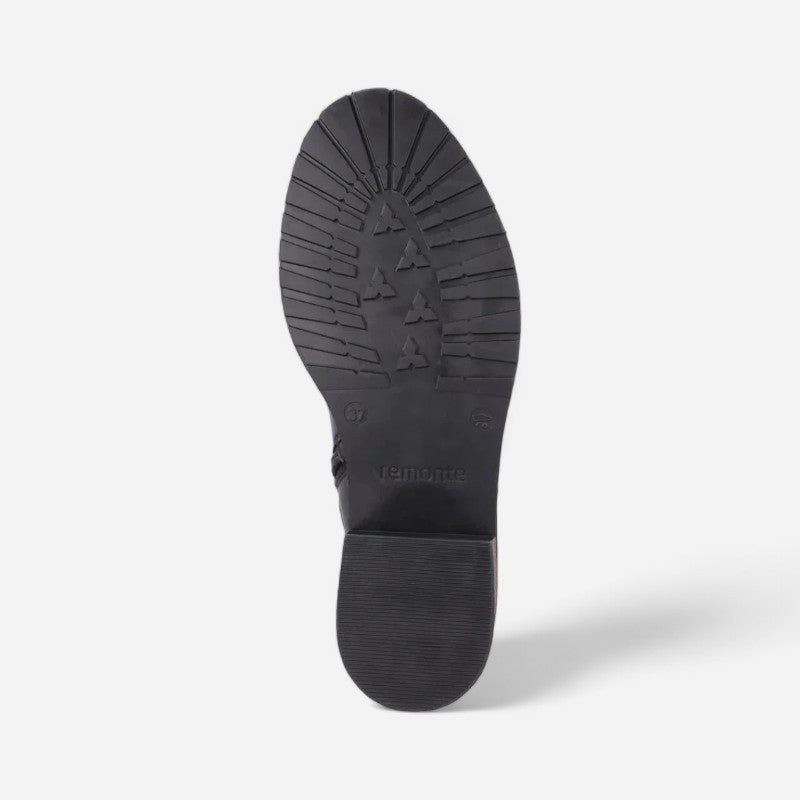 Modern style can be comfortable! These black leather remonte high boots made of smooth leather will make the hearts of fashion-conscious women beat faster. The zipper allows for the shoe to be put on very quickly. The round decorative buckle on the side is a real eye-catcher. A grippy and flexible sole with block heel as well as the padded and removable insole are further arguments for these high boots. The shoe has the Vario Shaft feature, which allows for an individually adjustable shaft width. Jackpot!