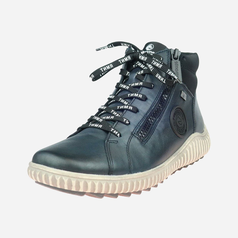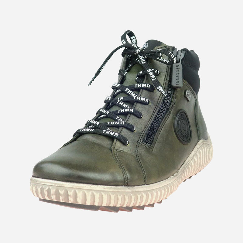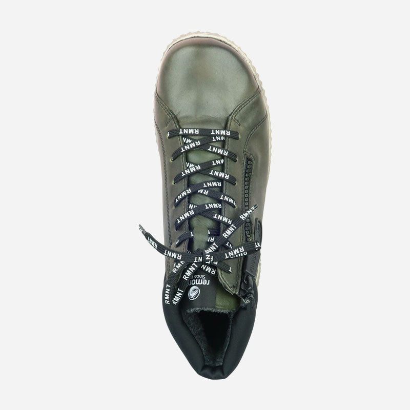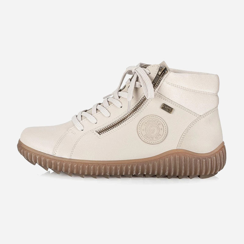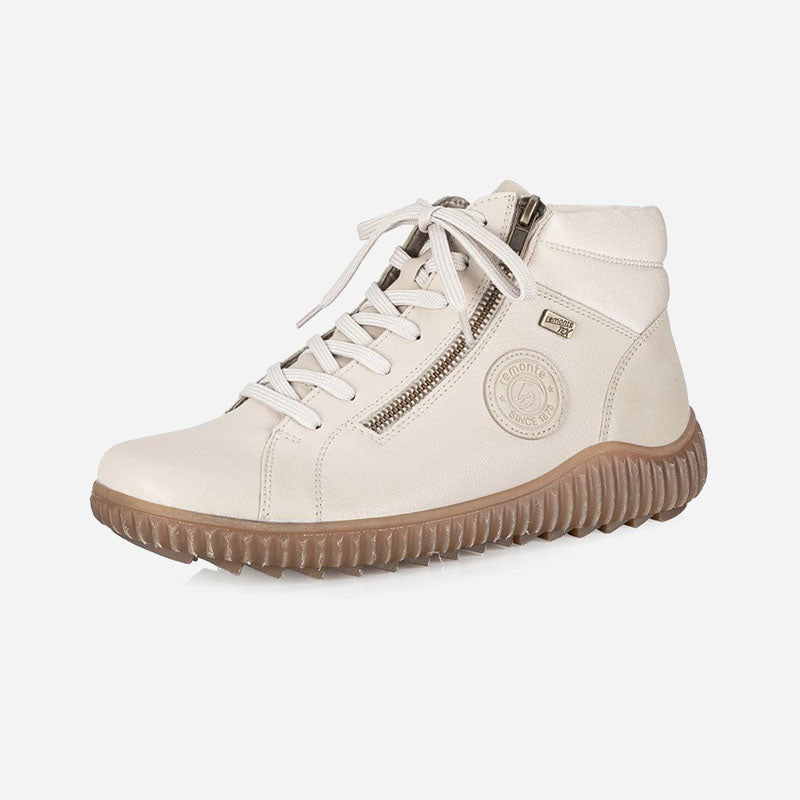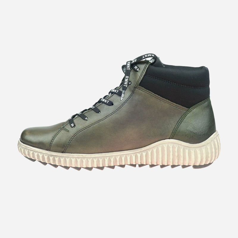 Stay warm and dry in these superbly comfortable high top lace up sneakers. Crafted from a soft leather and available in chestut and bronze with a wool trim. Featuring a convenient side zip, cushioned footbed and corrugated, non-slip gummy sole, these boots will give your feet all day warmth, comfort and support. Featuring Remonte's waterproof lining, Remonte TEX. European sizing. Leather upper, material and woolen lining, synthetic sole. Flat heel.
