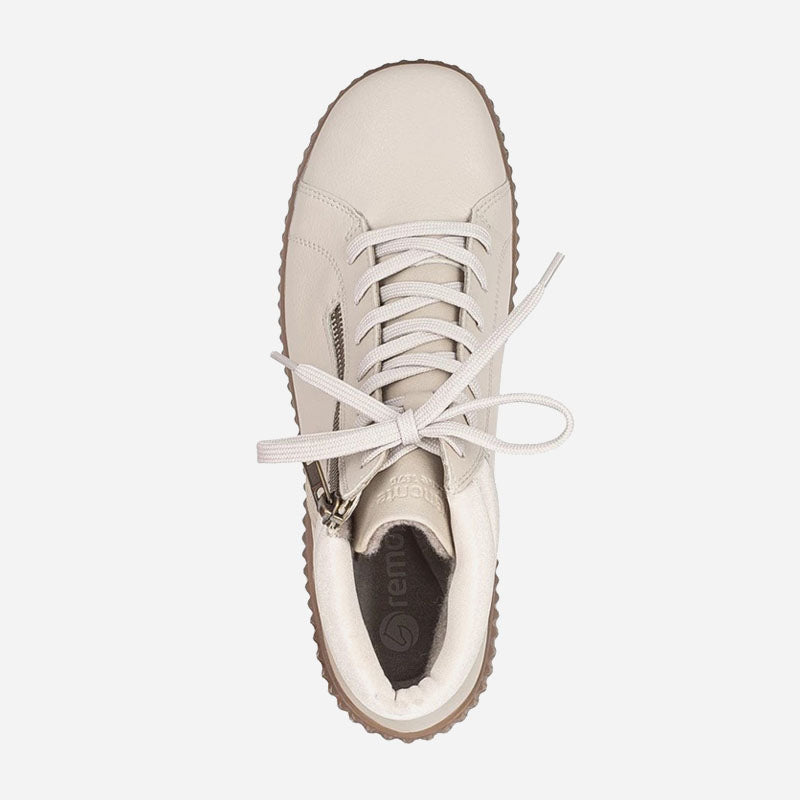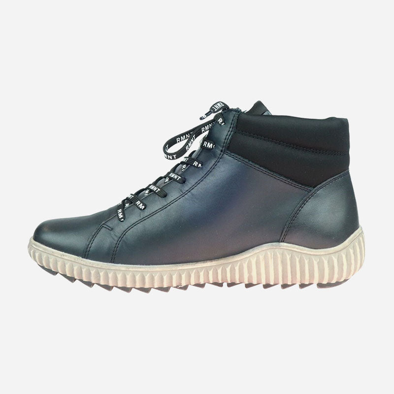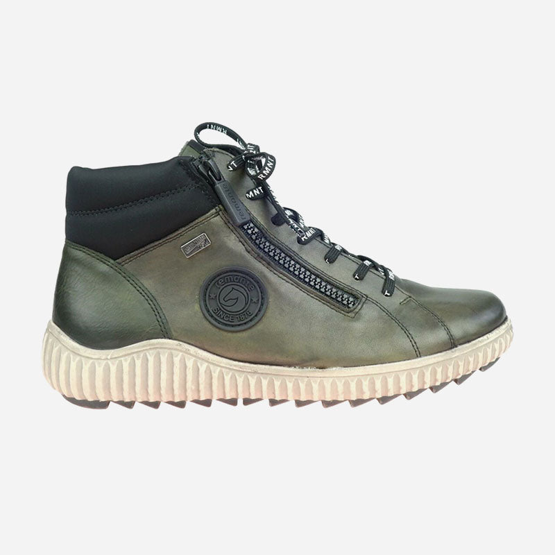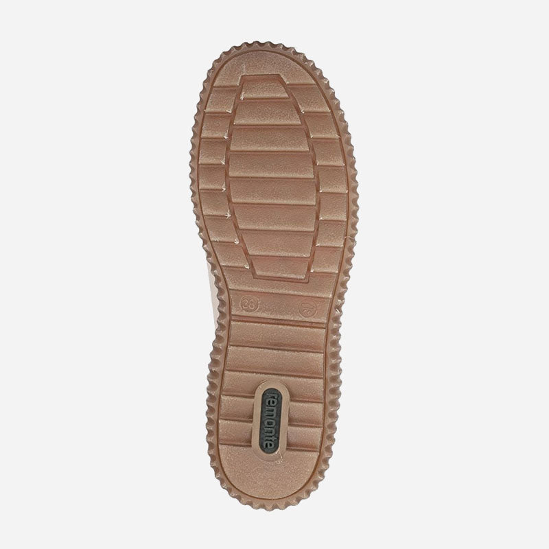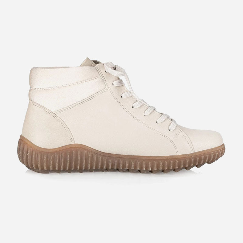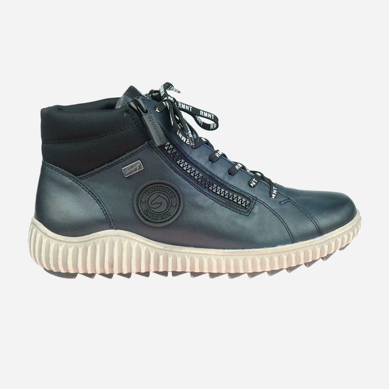 Stay warm and dry in these superbly comfortable high top lace up sneakers. Crafted from a soft leather and available in chestut and bronze with a wool trim. Featuring a convenient side zip, cushioned footbed and corrugated, non-slip gummy sole, these boots will give your feet all day warmth, comfort and support. Featuring Remonte's waterproof lining, Remonte TEX. European sizing. Leather upper, material and woolen lining, synthetic sole. Flat heel.