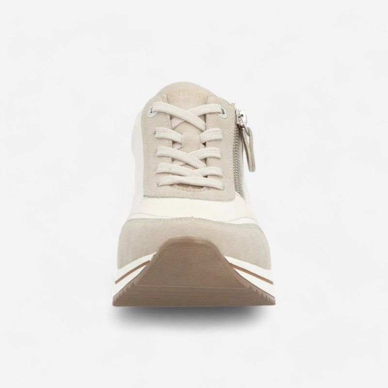 Hottest wedge sneaker in town: the khaki green sneakers by Remonte made of smooth leather are an absolute must-have in every shoe wardrobe. The lacing complements the zipper and thus guarantees optimal support and perfect fit. The glittering spots on the back side provide the perfect finish and a striking look. Thanks to the proven Remonte Lite 'n Soft technology, a super light sole and a soft exchangeable footbed come together. The sneakers are equipped with a light microvelour lining. It doesn't get any more comfortable than this!