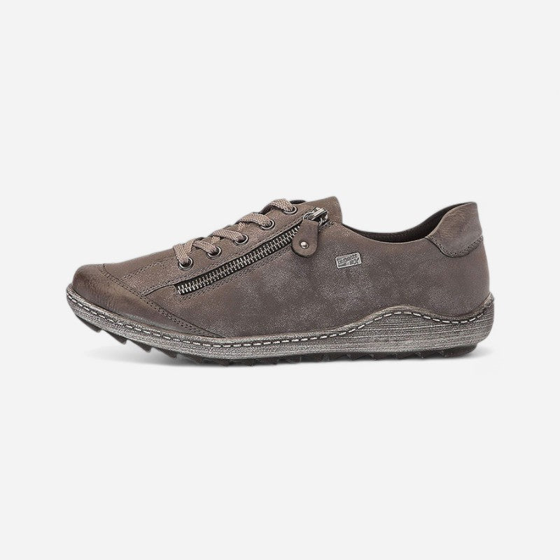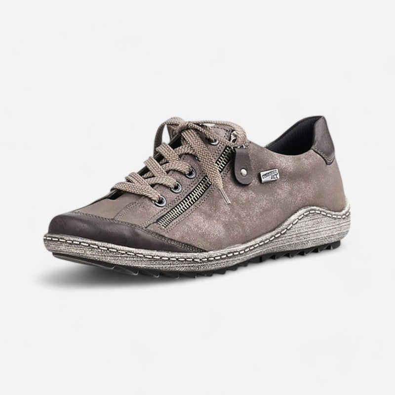 Here is an adorable water-resistant leather sneaker that complements your style while providing the best of modern fashion-comfort technology. With its laced-up adjustablity, easy on/off side zipper, Memosoft cushioning, and rubberized outsole, you'll walk in cushioned confidence all season long.