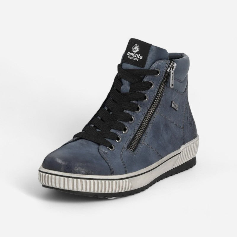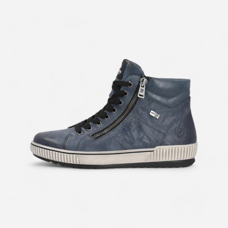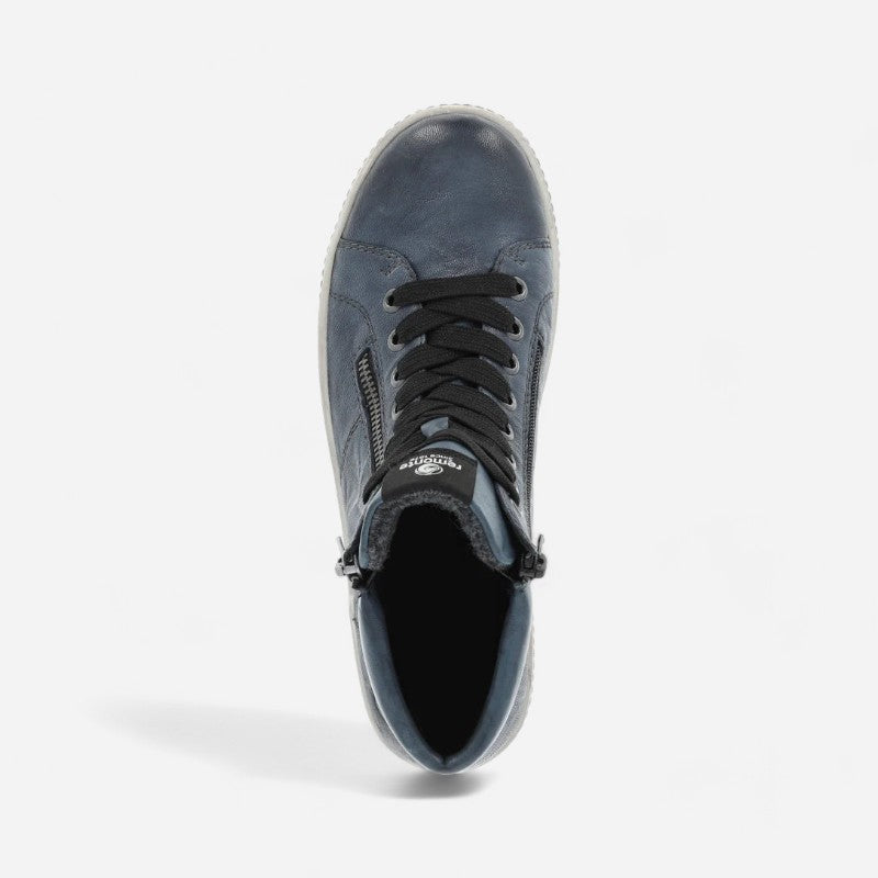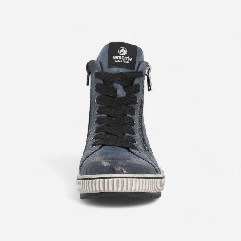 A shoe for all occasions! These blue remonte lace-up boots made of smooth leather will impress fashion-conscious women with their great features. The clever combination of lacing and zipper makes the shoe easy to put on and take off. A flexible and cushioning sole as well as the padded and removable insole are further arguments for these boots. The comfort width offers enough space for the feet to feel comfortable even when worn for longer periods.