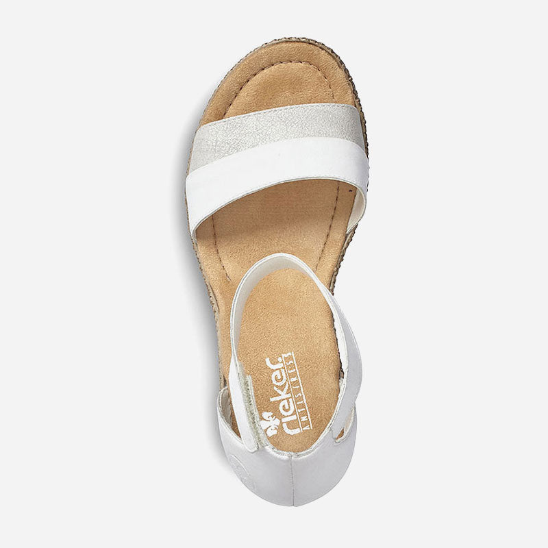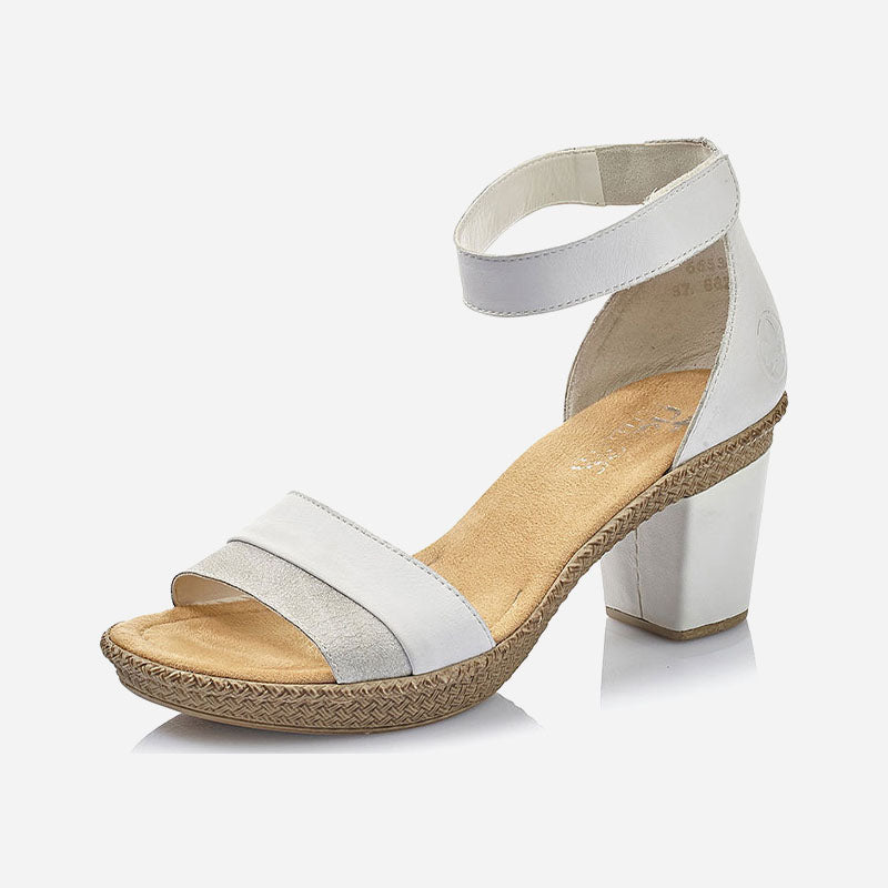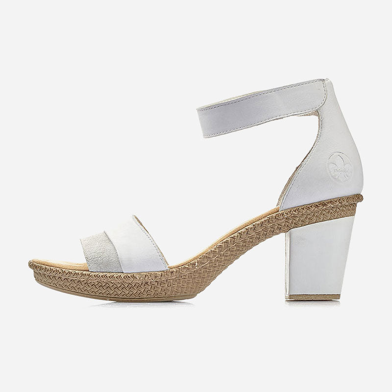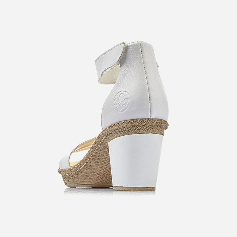 The Rieker 66534 Rabea is a casual Women's high heel sandal with an adjustable ankle strap and jute patterned sole.