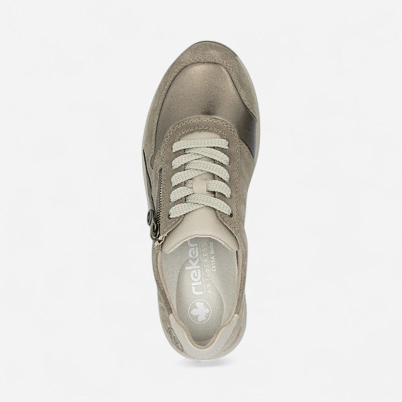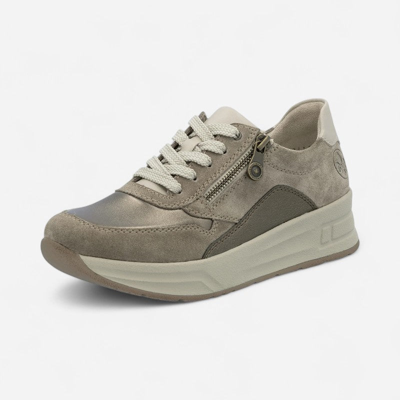 Step out in style with the Rieker N8114 Doerte Sneaker, designed for women who love a trendy look without sacrificing comfort. Featuring a clever mix of materials with subtle shine and a discreet logo, these sneakers catch the eye softly. The combination of laces and a handy zipper lets you slip them on easily and get the perfect fit. Inside, a soft, shaped, removable insole keeps your feet happy all day, while the higher, stable sole absorbs shocks and keeps you confidently on the move. Perfect for busy days or casual outings, these shoes bring playful style and lasting comfort together.