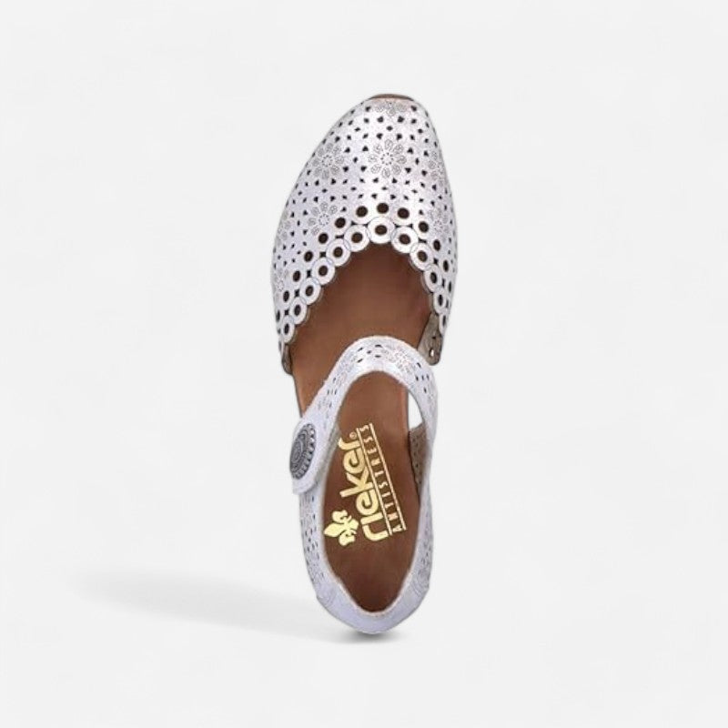 This daintily practical low-heeled beauty slips on with ease for occasions dressy or casual, with an adjustable ankle strap for a custom fit. Its all-over laser-cut design adds a unique flair to this timeless shoe.