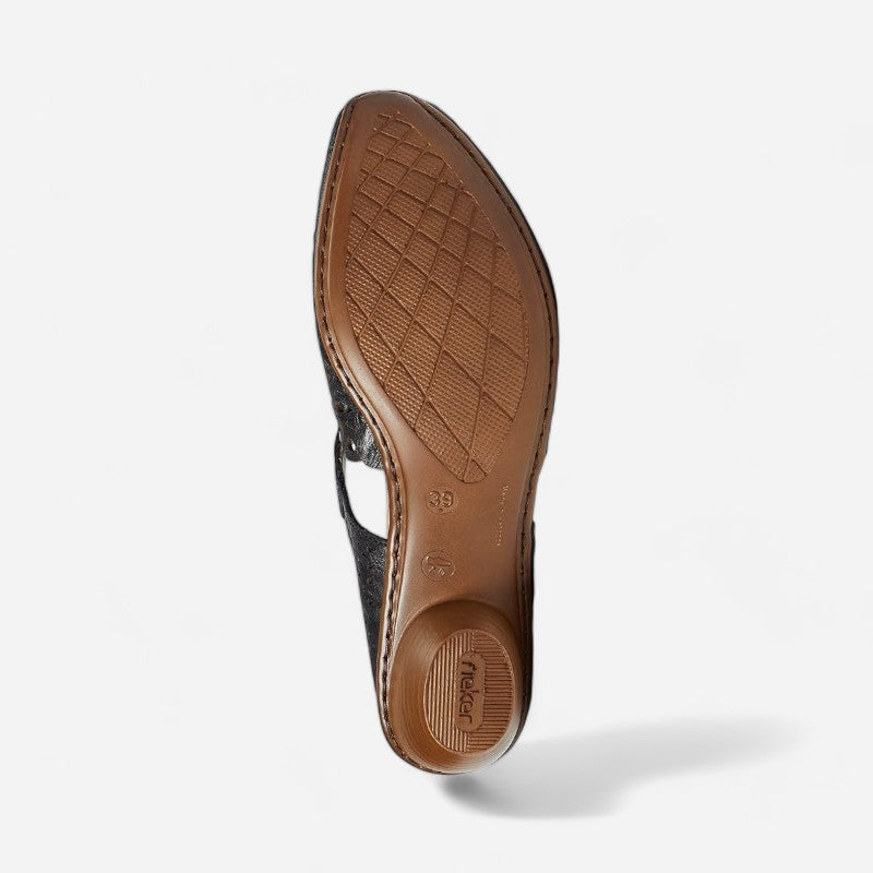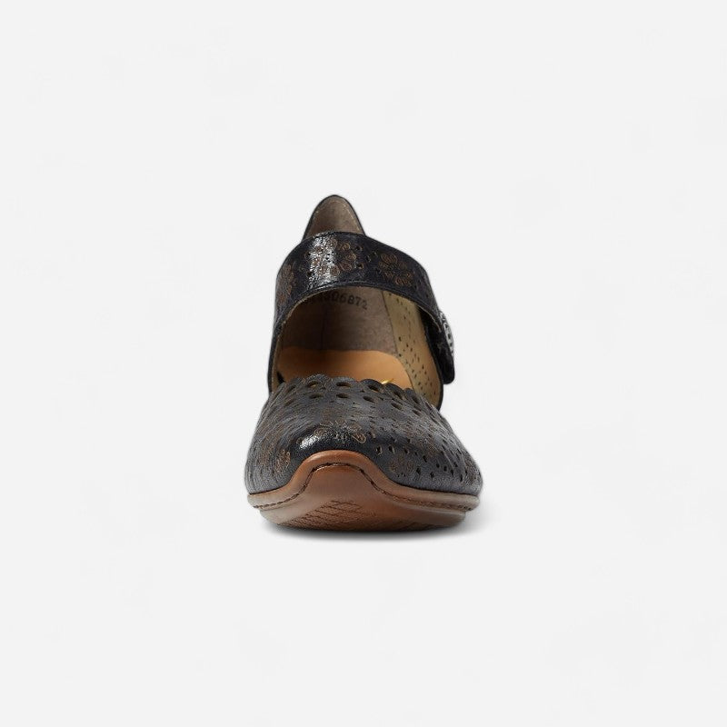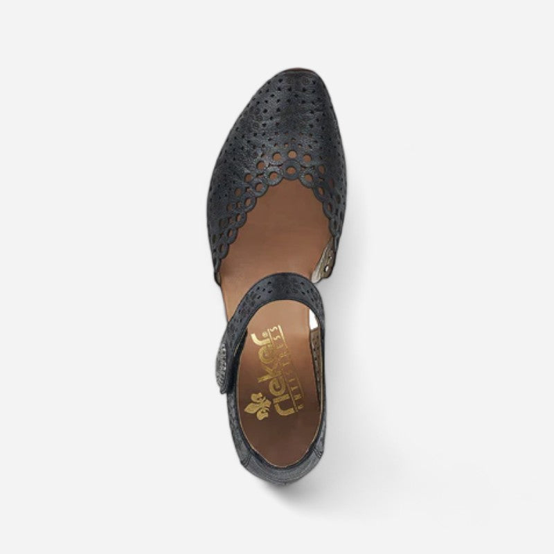 This daintily practical low-heeled beauty slips on with ease for occasions dressy or casual, with an adjustable ankle strap for a custom fit. Its all-over laser-cut design adds a unique flair to this timeless shoe.