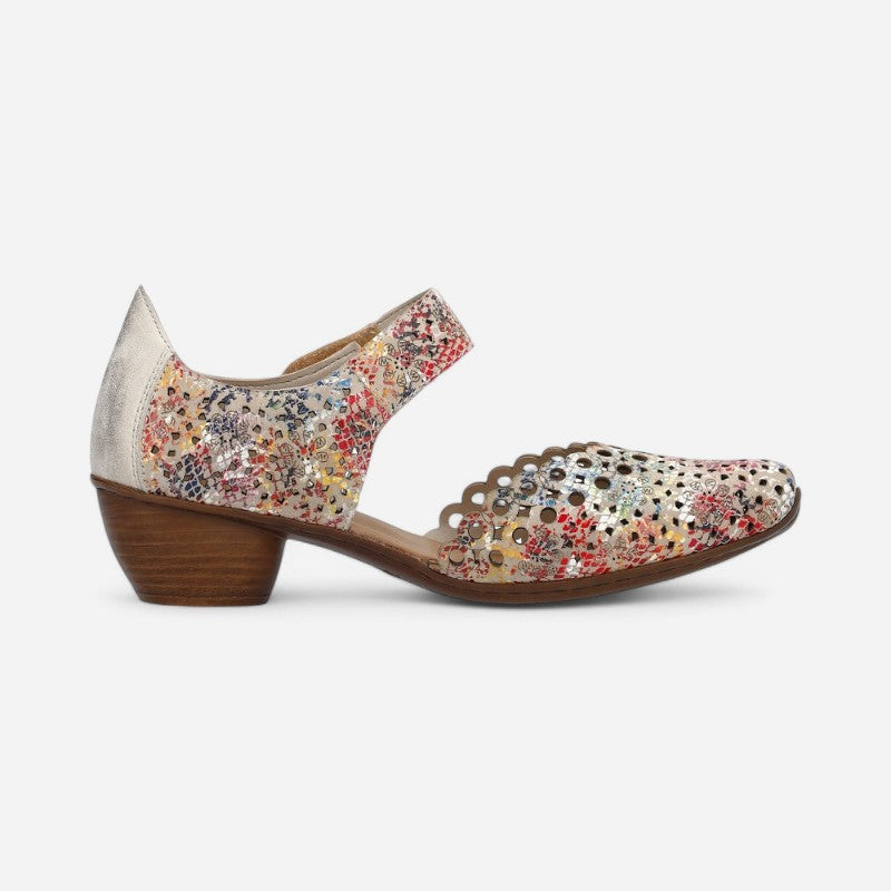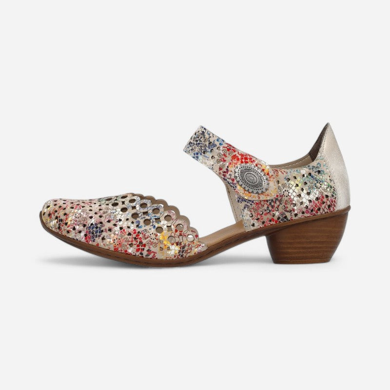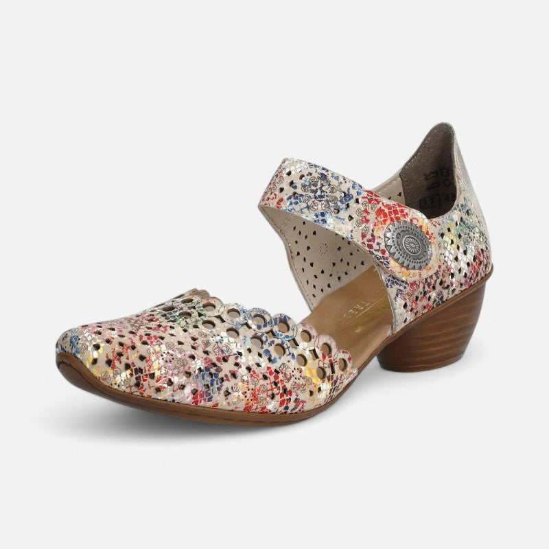 This daintily practical low-heeled beauty slips on with ease for occasions dressy or casual, with an adjustable ankle strap for a custom fit. Its all-over laser-cut design adds a unique flair to this timeless shoe.