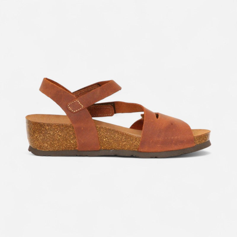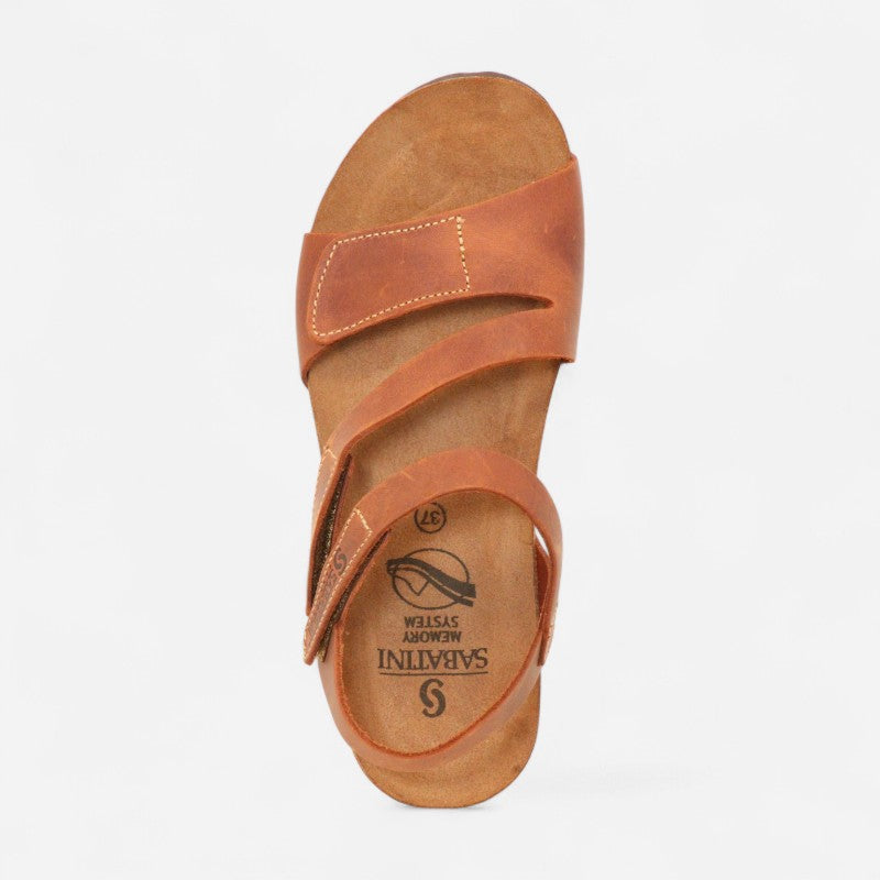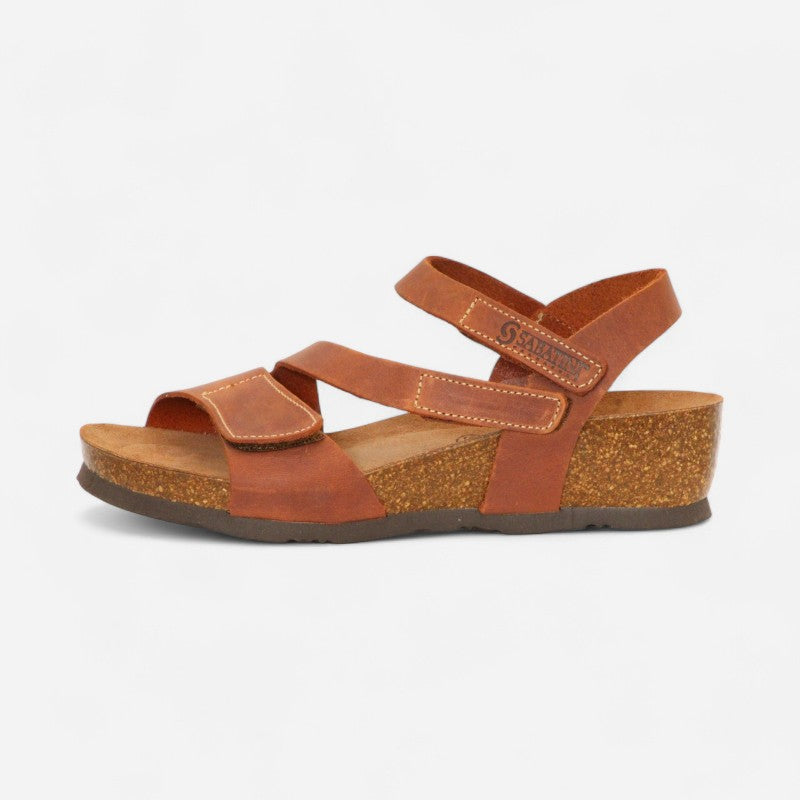 Cute and playful sandal from Sabatini is the 4013. The soft oiled leather upper is fastened with velcro over the instep, toes and ankle. Lined with leather and a lightly cushioned, arch supportive footbed. The sole is light with a cork base and rubber sole. 1 and 1/2 inch wedge with a 1-inch platform. Sabatini shoes are made in Italy.